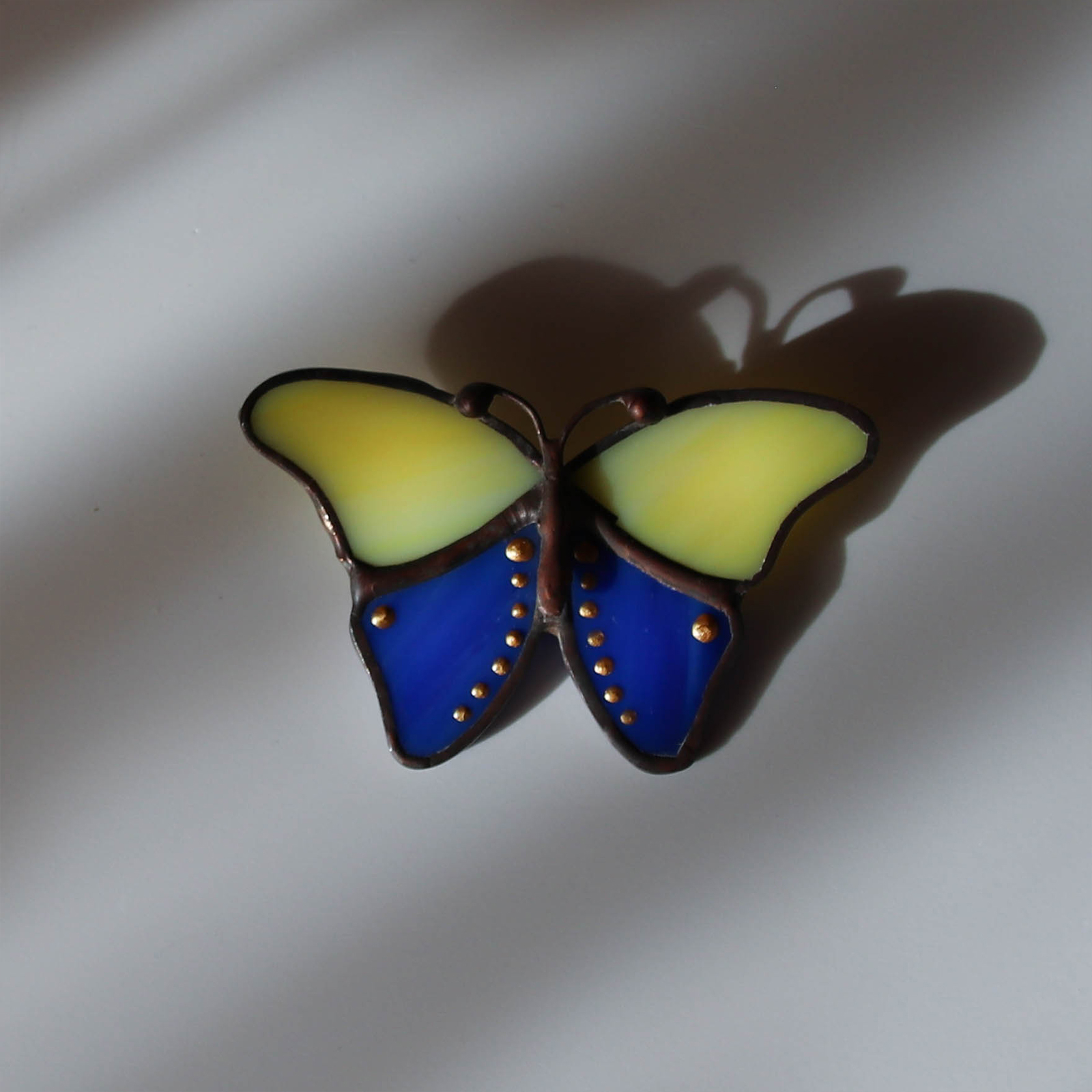 Broșă handmade în formă de fluture, realizată din sticlă vitraliu albastră și galbenă opalescentă, cu decor pictat pe aripile albastre.