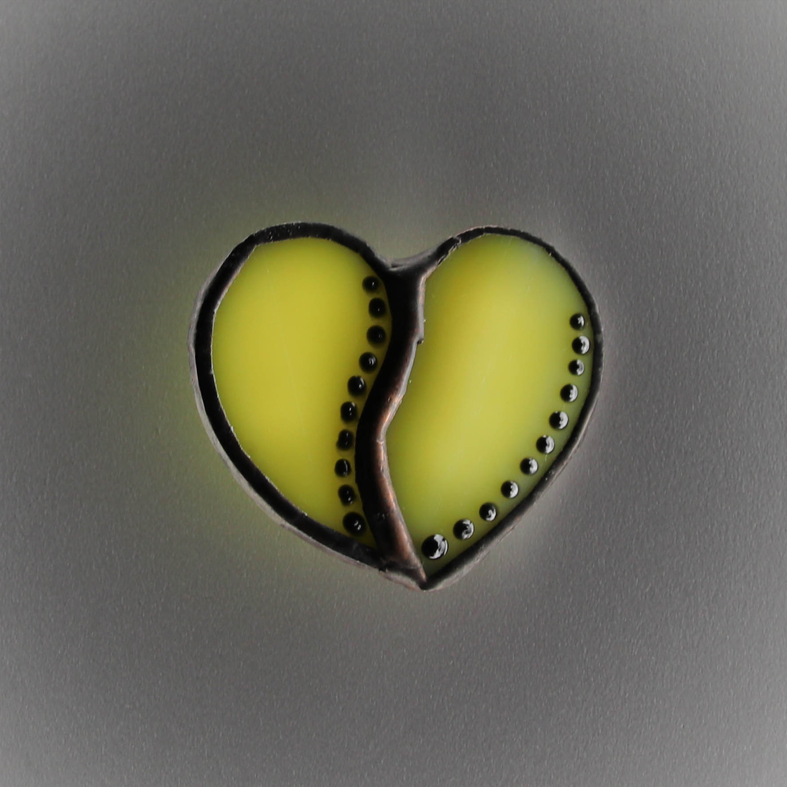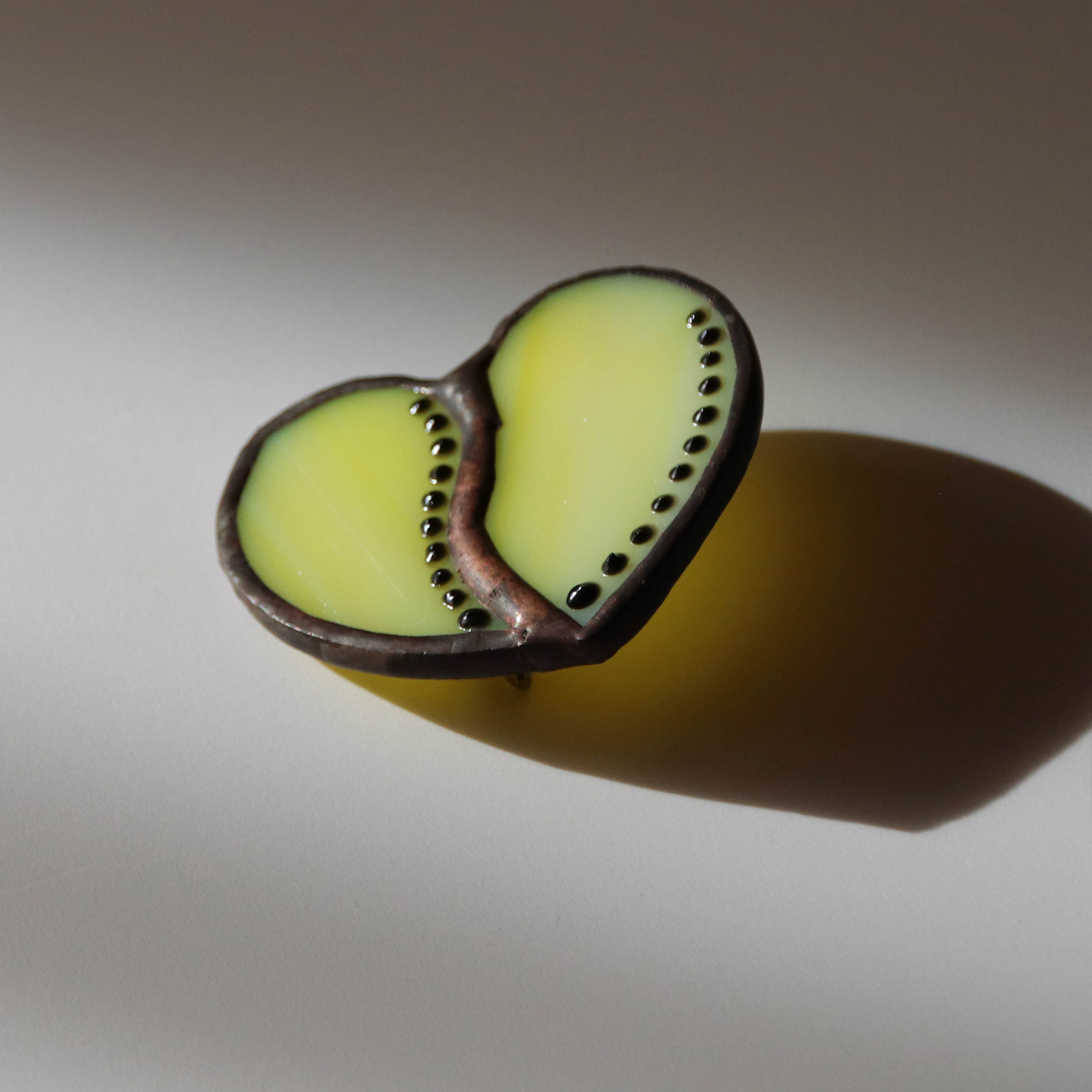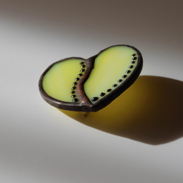 Brosa mica si delicata, realizata din sticla vitraliu galbena, opalescenta, cu decor punctiform pictat manual.
