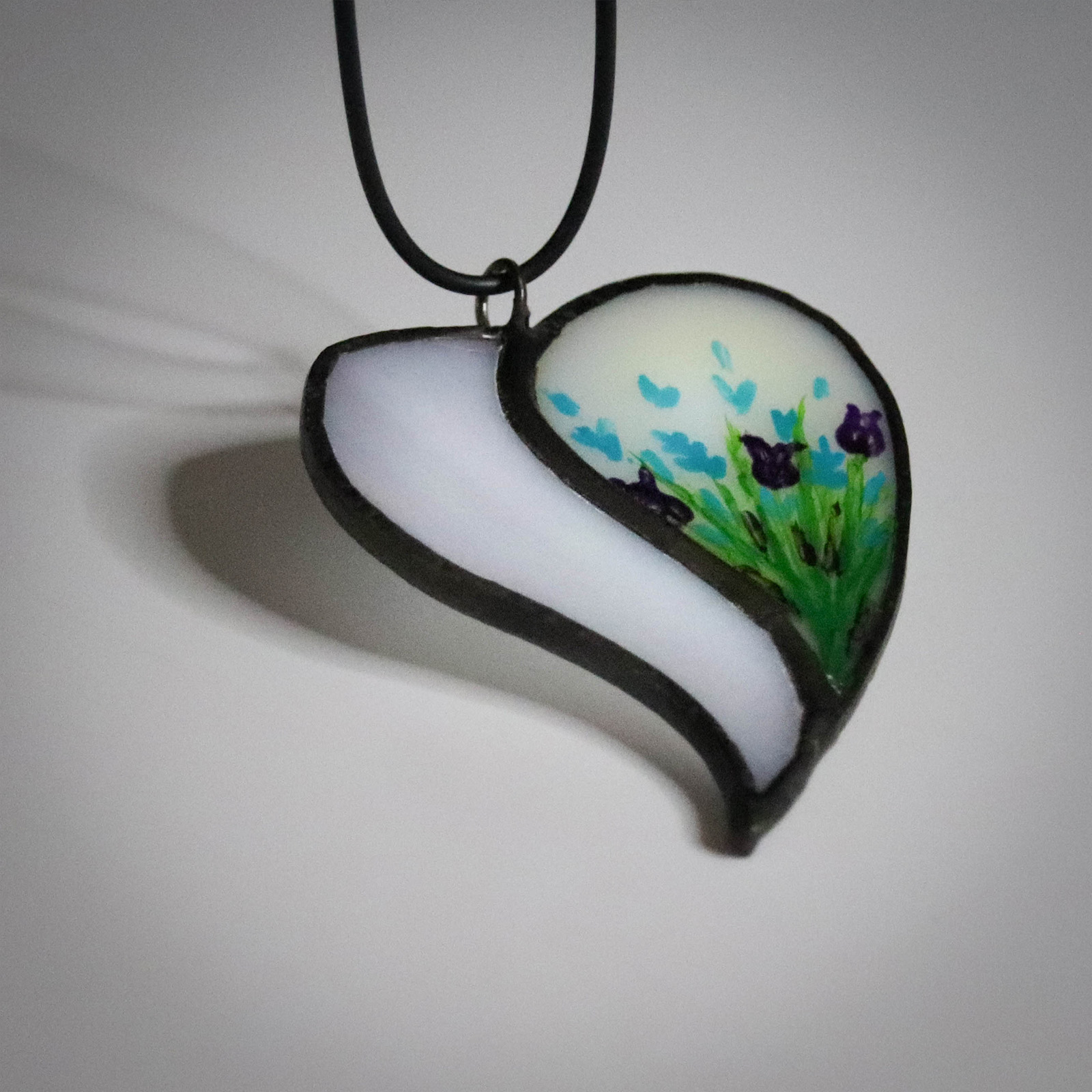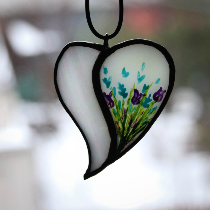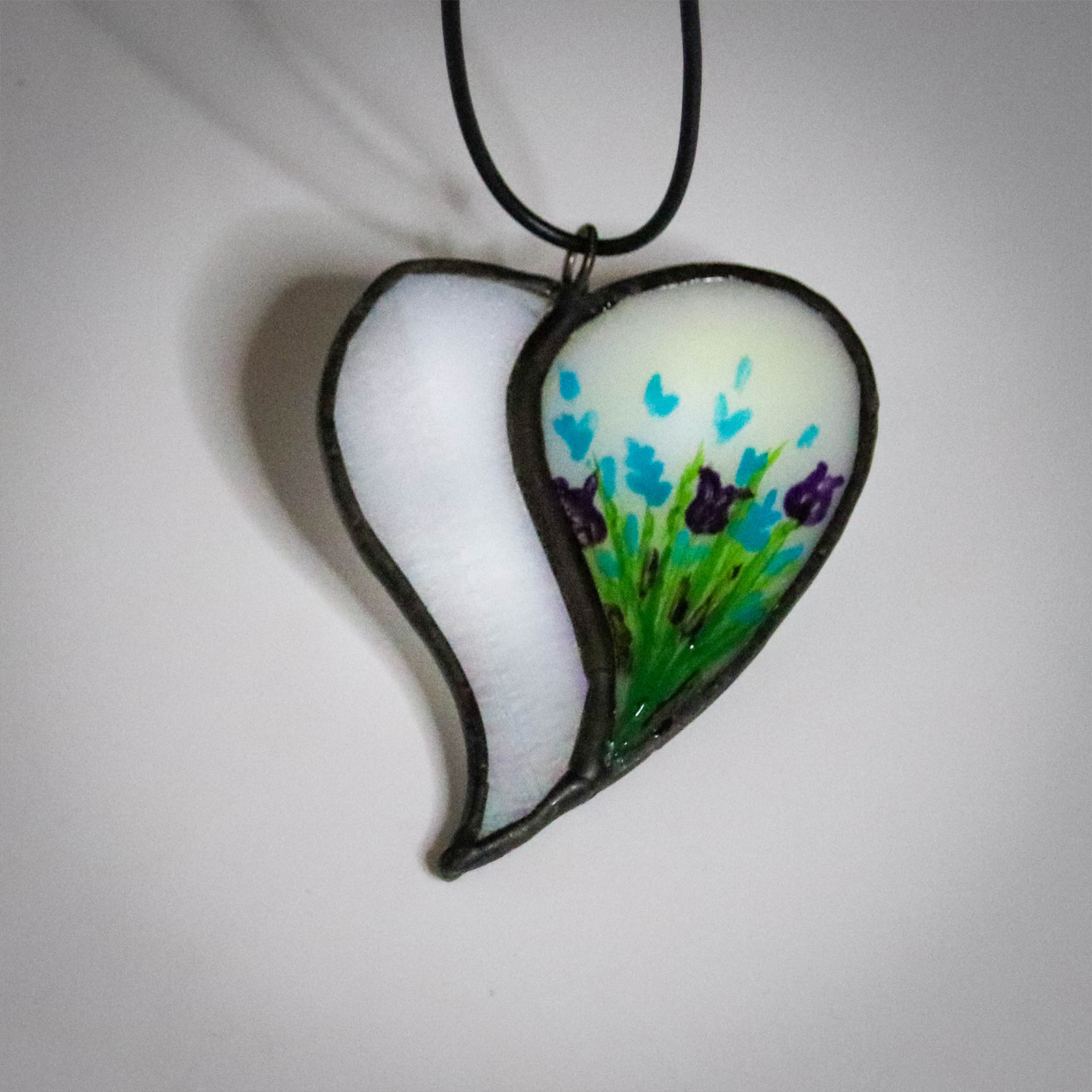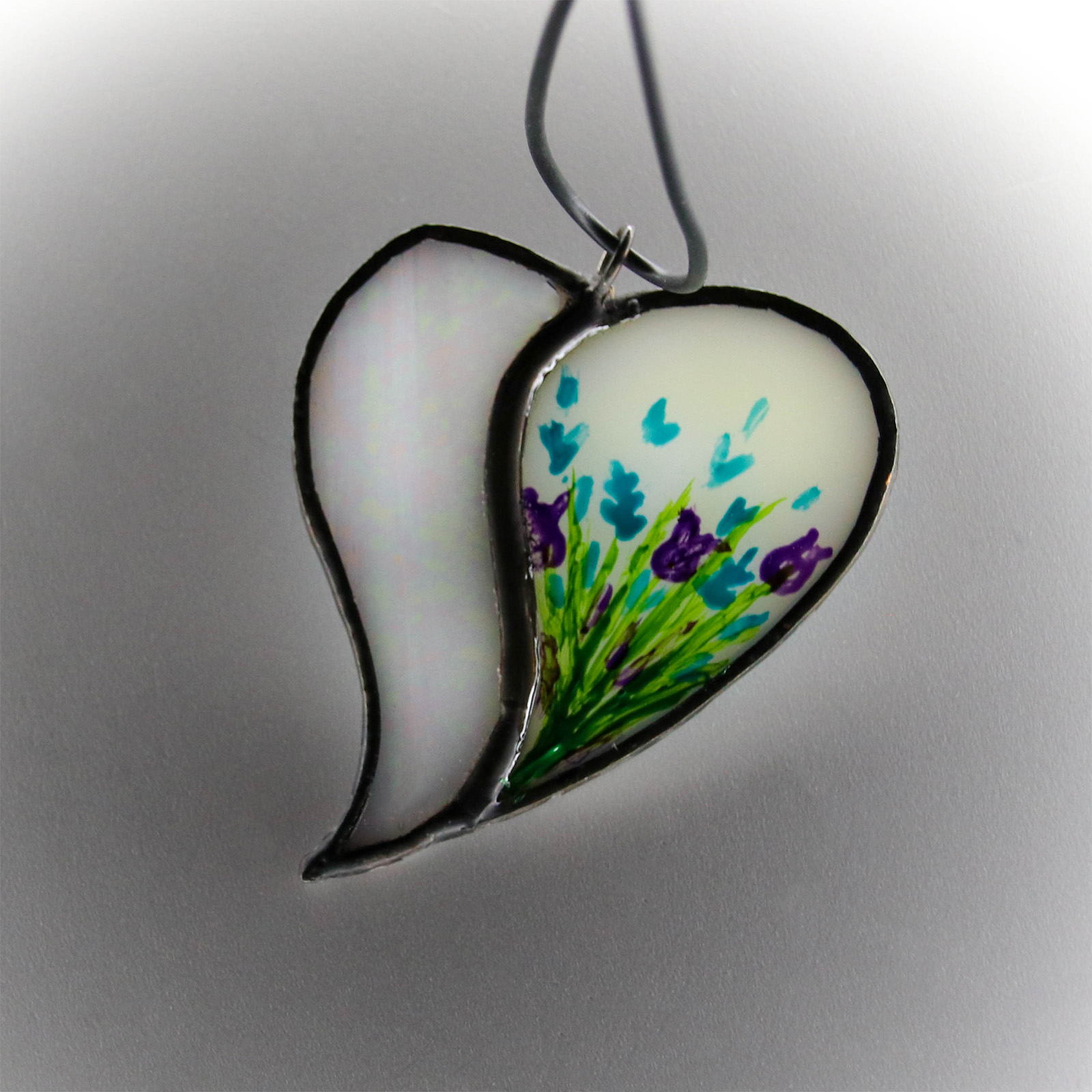 Pandantiv din sticla vitraliu alba opalescenta, pictat cu flori de primavara.
