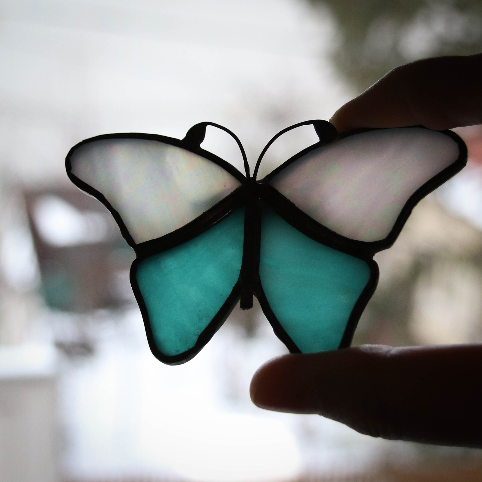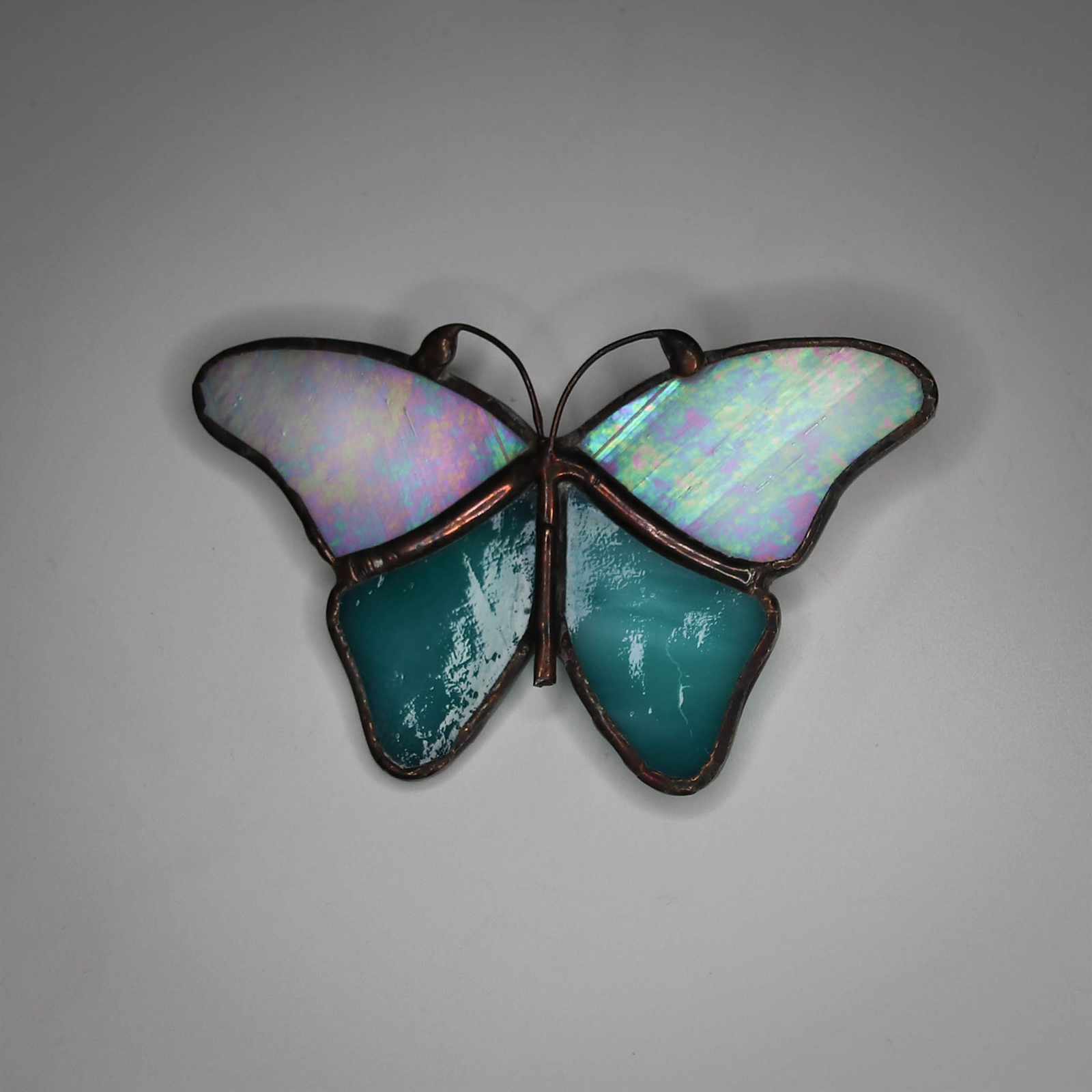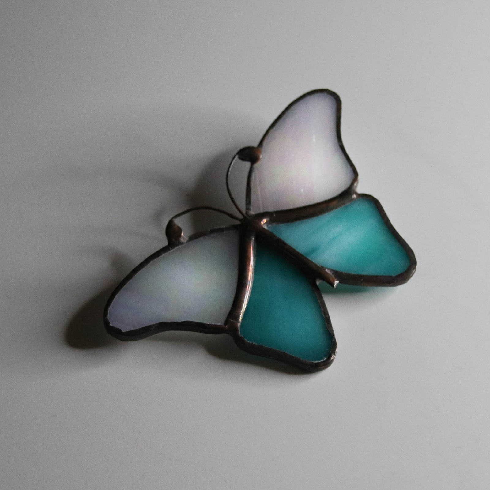 Brosa eleganta in forma de fluture, realizata manual din doua tipuri de sticla vitraliu: una turcoaz, vibranta si transparenta, si una alb sidefata, cu reflexii delicate.