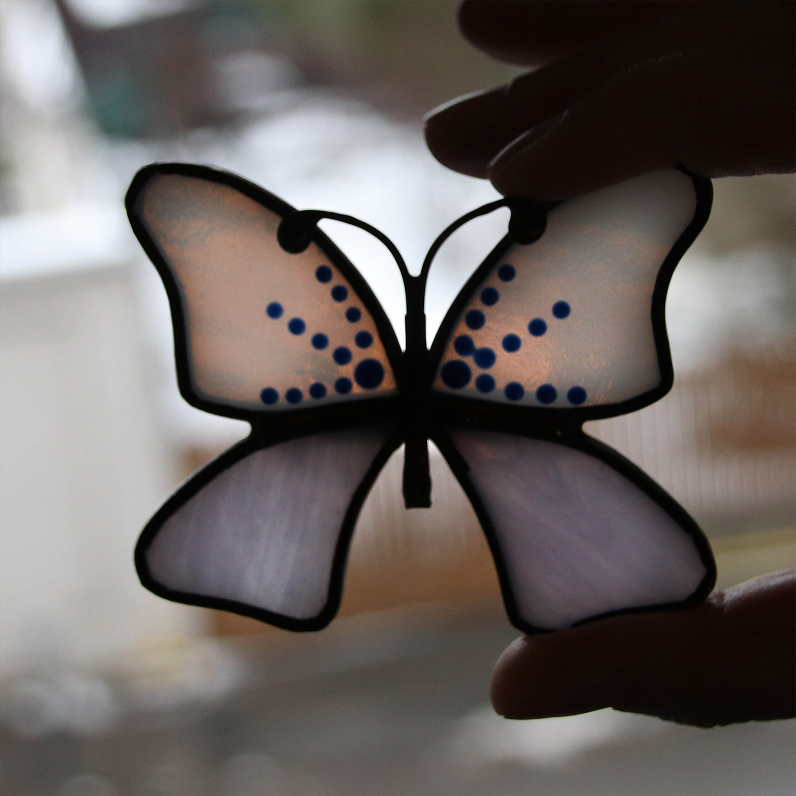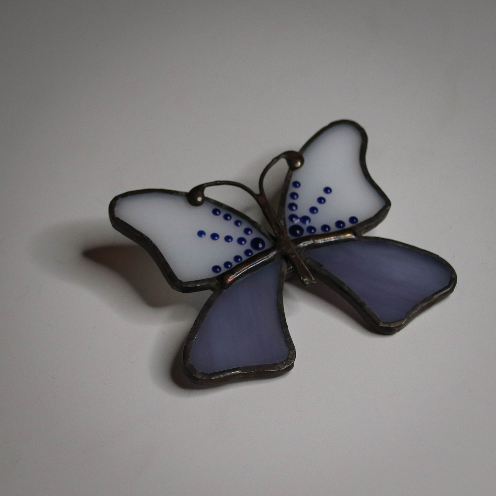 Aceasta brosa in forma de fluture este realizata manual in tehnica Tiffany, din sticla vitraliu alba si bleu.