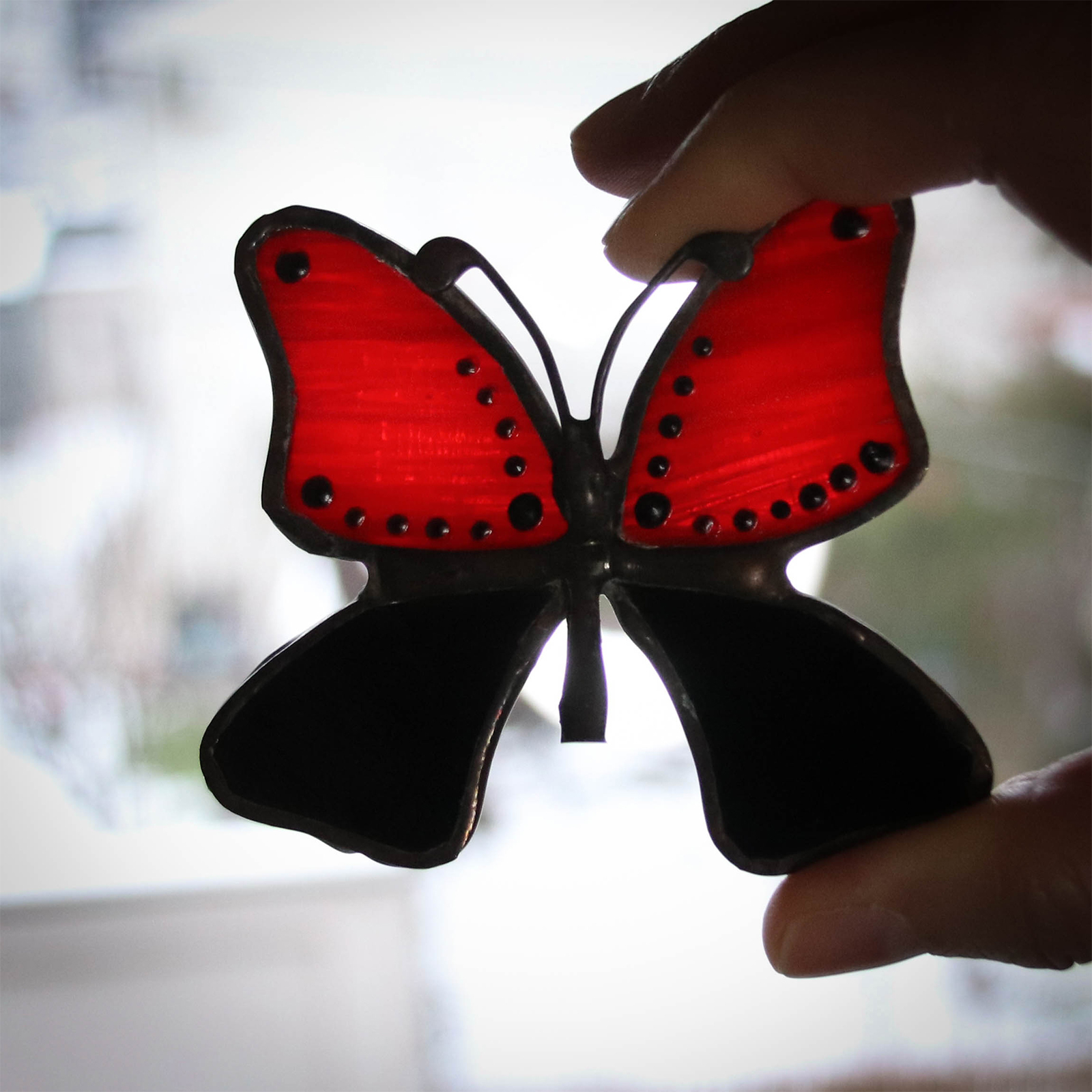 Materiale folosite: sticla vitraliu, cupru, cositor, ac de prindere.