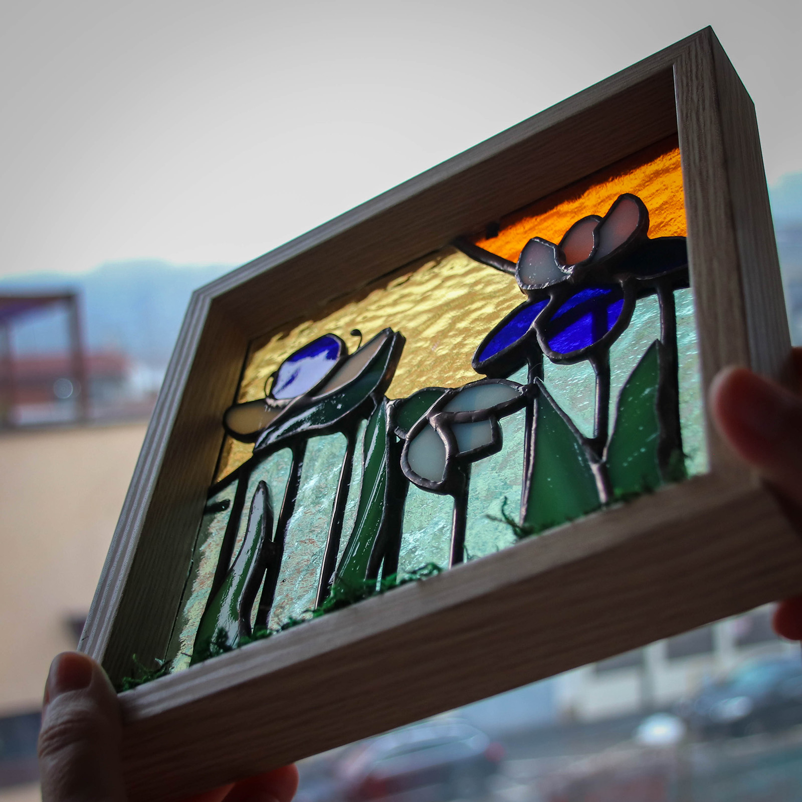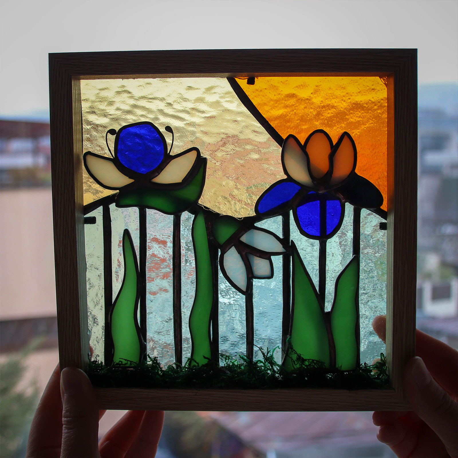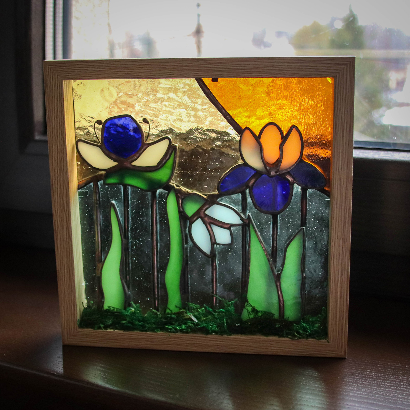 Un colt de primavara surprins in sticla. Acest decor tridimensional este compus din elemente florale realizate manual din sticla vitraliu, lipite in tehnica Tiffany si incadrate intr-o rama din lemn. Decoratiunea poate fi asezata pe un pervaz sau intr-un spatiu luminos, unde razele soarelui vor pune in valoare culorile sticlei si vor crea un joc special de lumina.