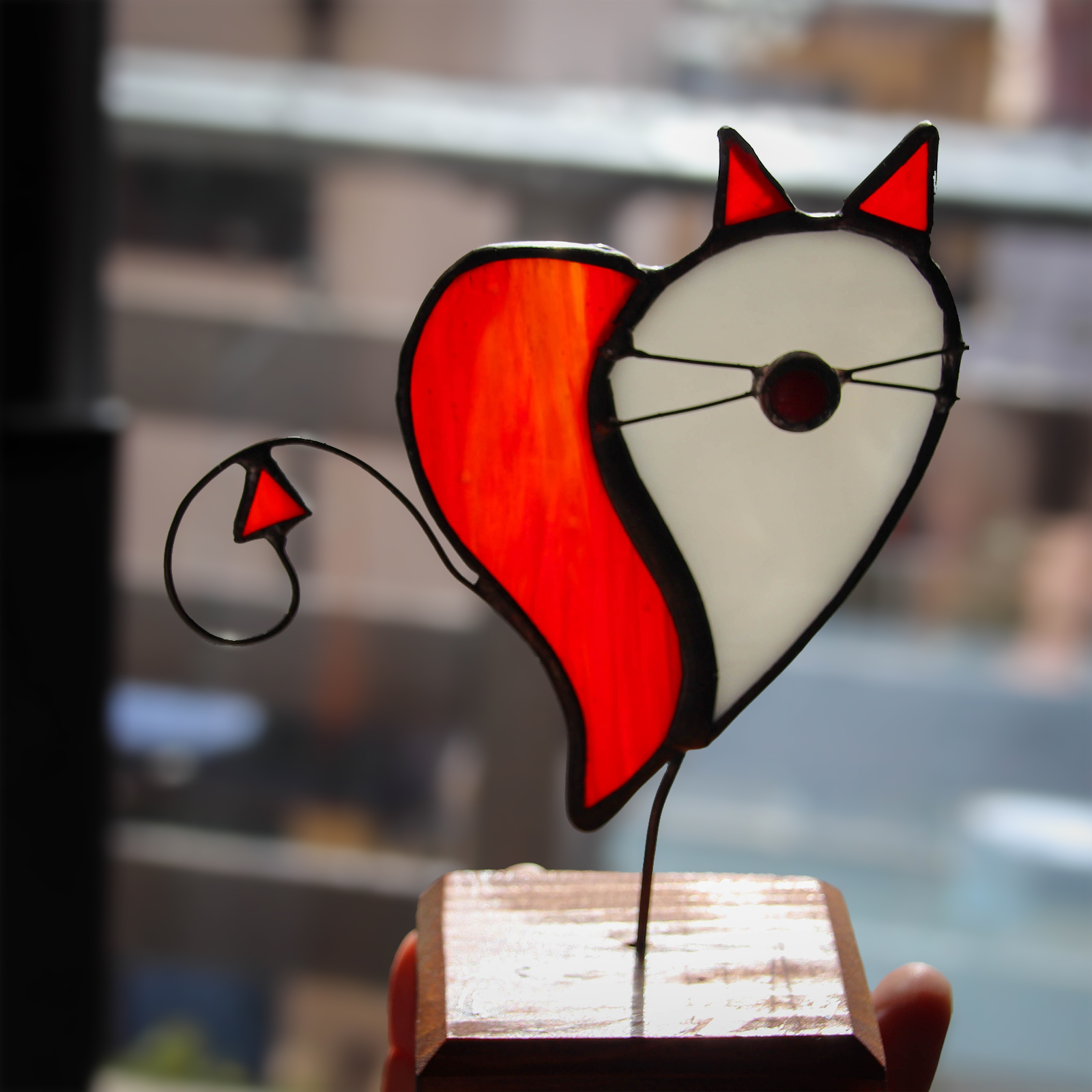 Decor in forma de inima si pisica din sticla vitraliu rosie si alba, cu suport din lemn. Materiale: sticla, cupru, cositor, lemn. Dimensiuni: 15 x 11 x 10 cm.