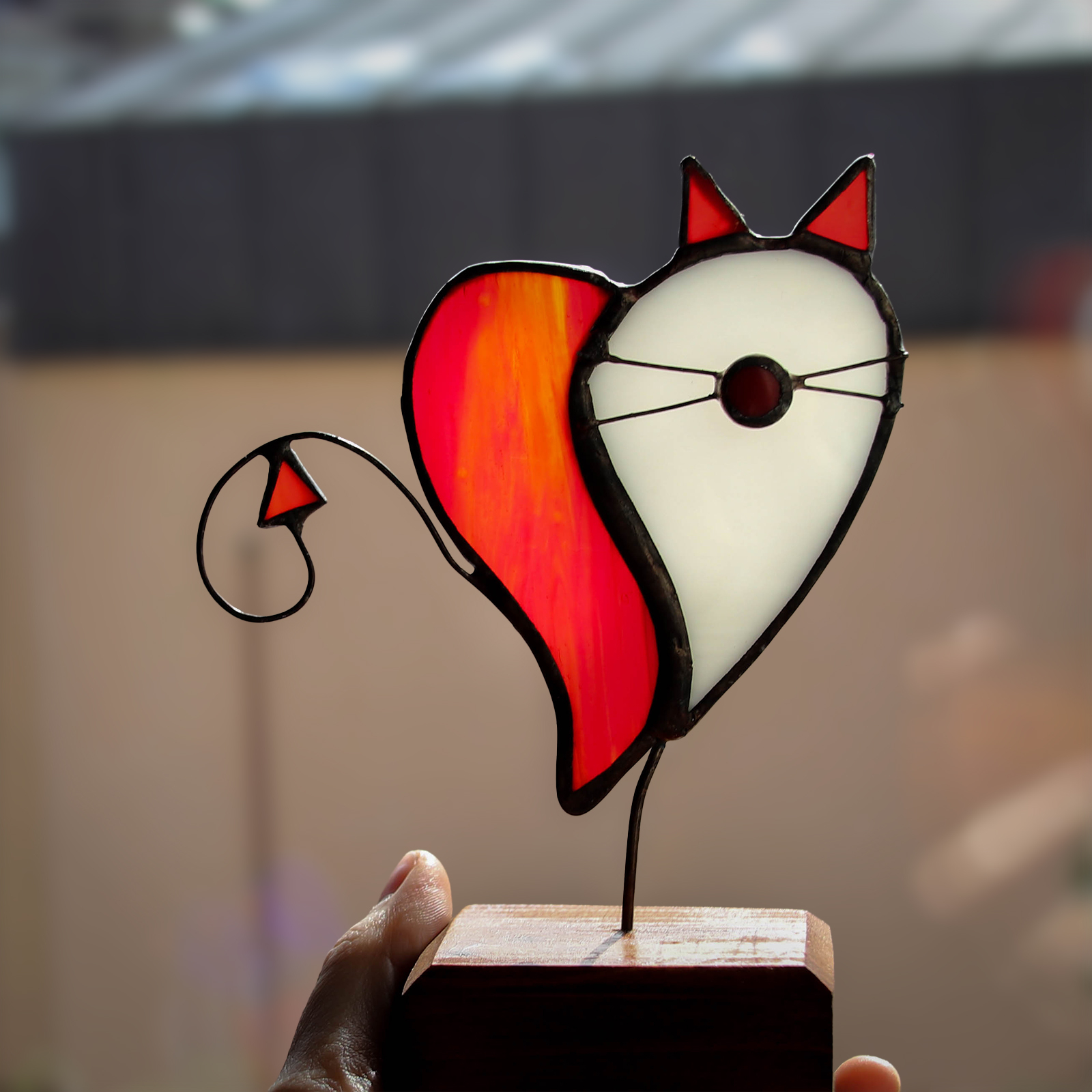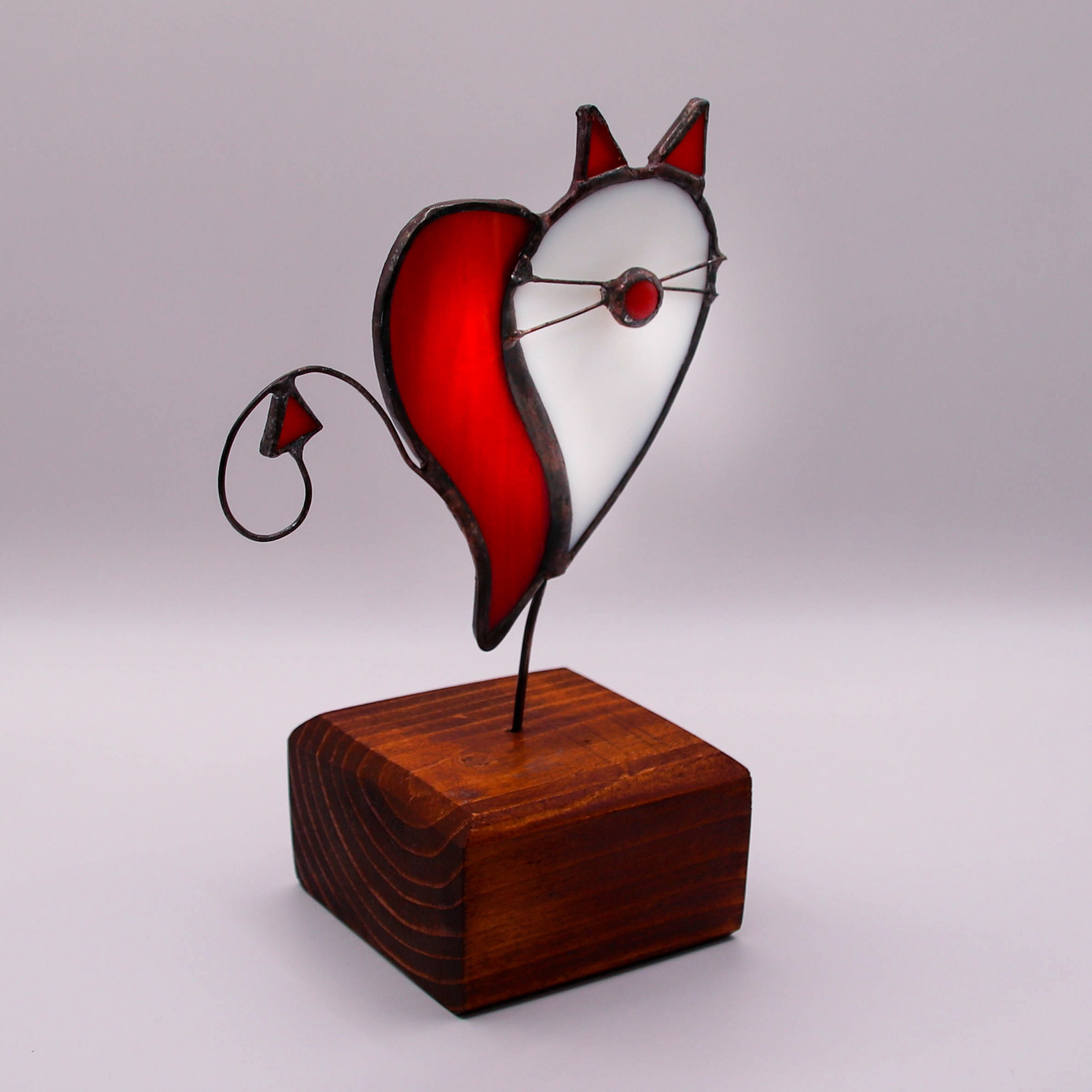O decoratiune cu dubla semnificatie: iubire si personalitate. Aceasta piesa unica imbina forma unei inimi cu silueta unei pisici, fiind realizata din doua bucati de sticla vitraliu – rosie si alba – care se completeaza armonios.