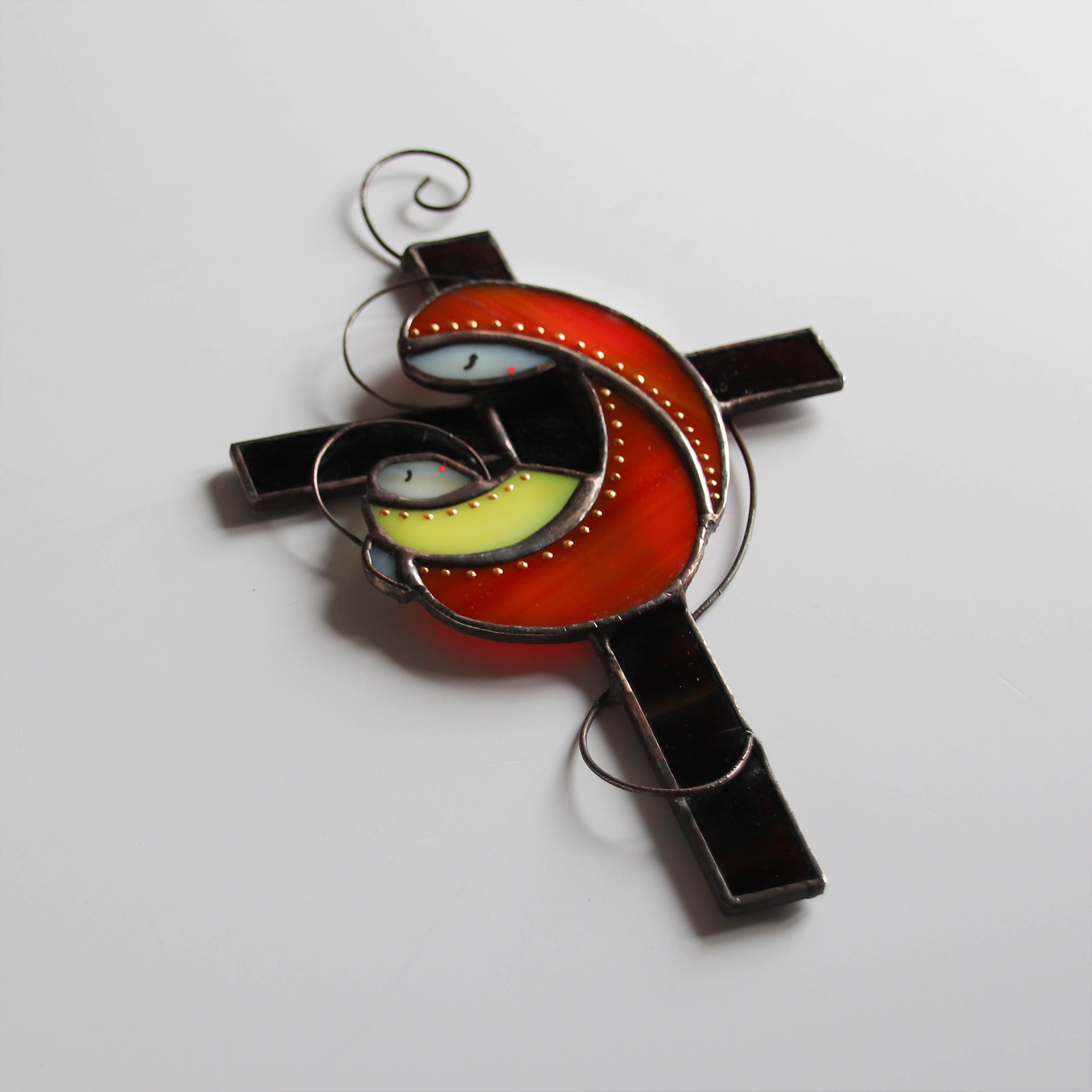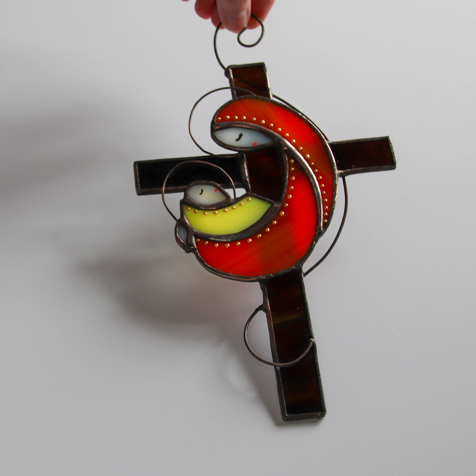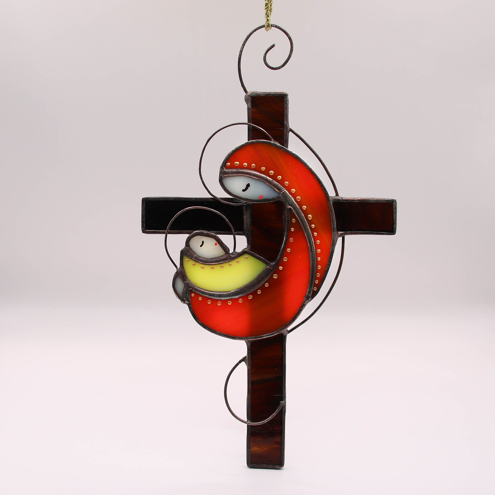 Decor din sticla vitraliu reprezentand Maria si Pruncul, cu element decorativ tip cruce.