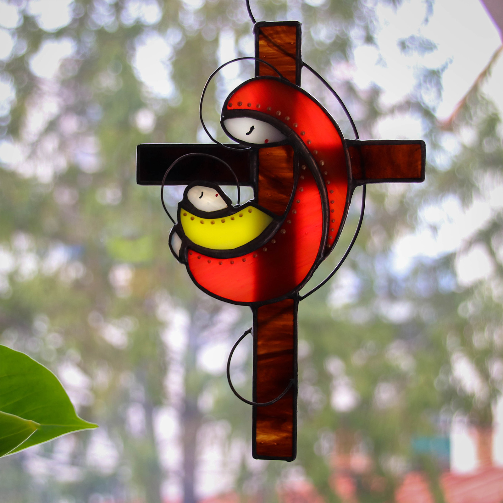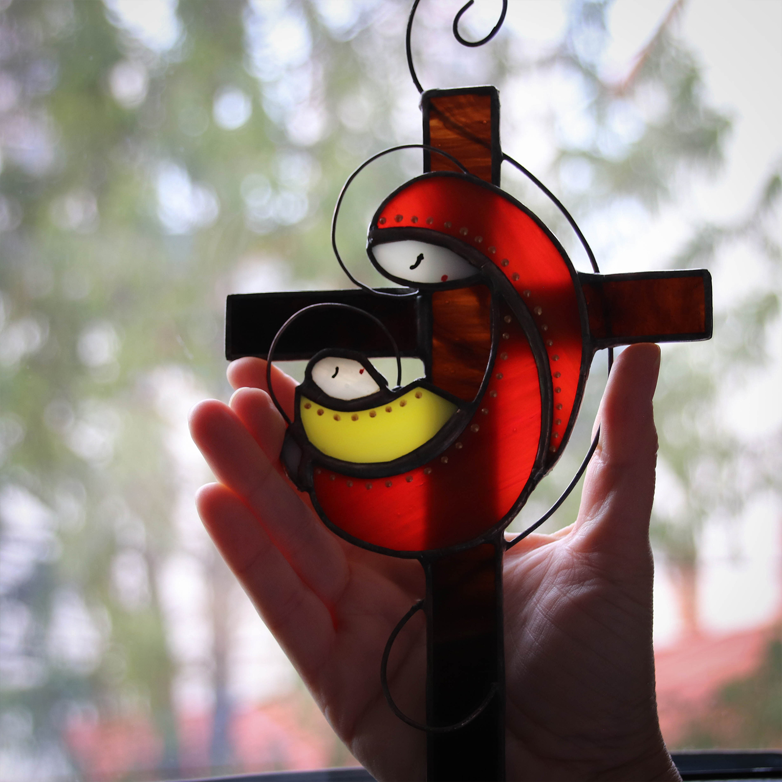 O piesa delicata care transmite calm si echilibru prin lumina si culoare. Aceasta decoratiune din vitraliu, reprezentand silueta Mariei cu pruncul, este realizata manual si completata de un fundal in forma de cruce cu irizatii maro, ce amintesc de textura lemnului.