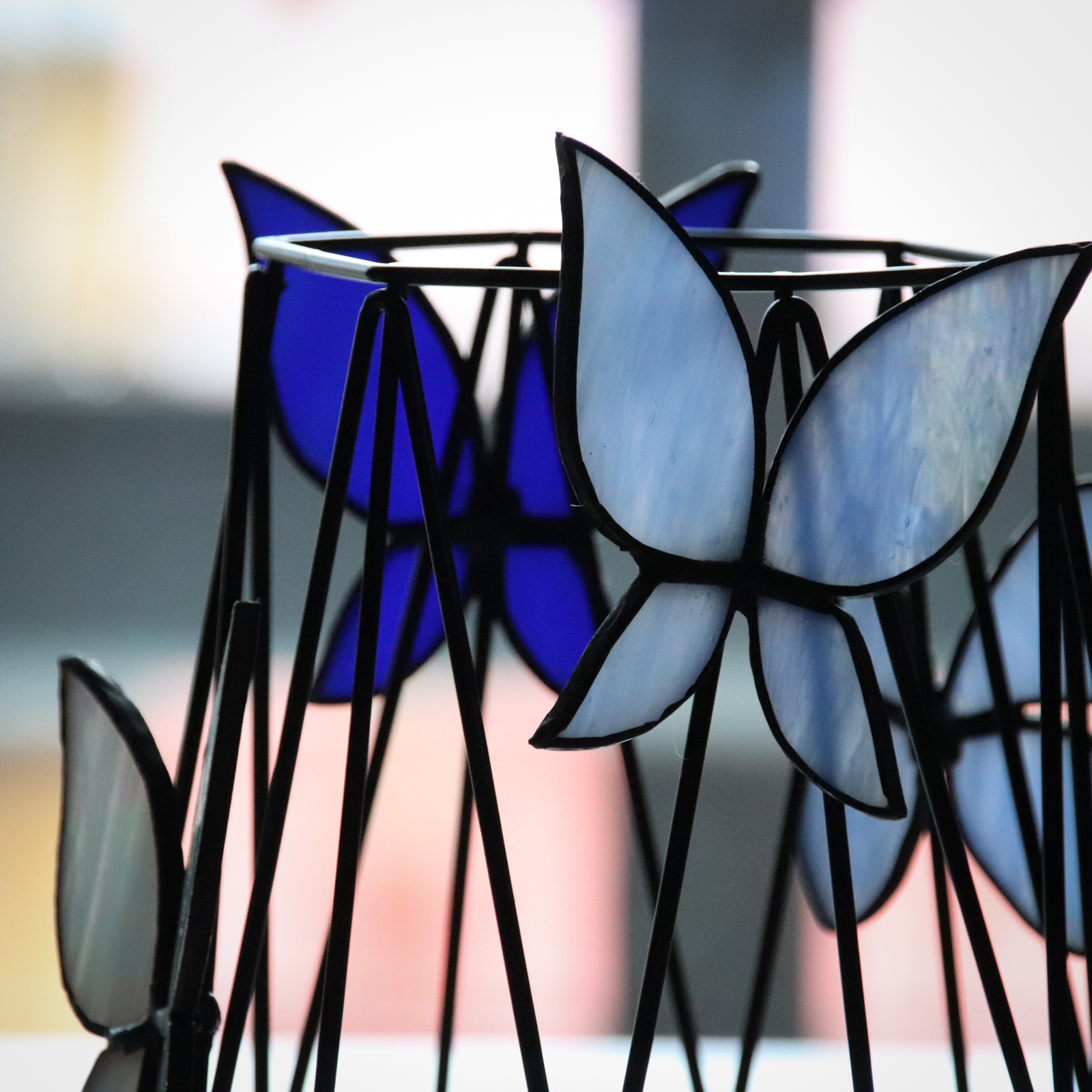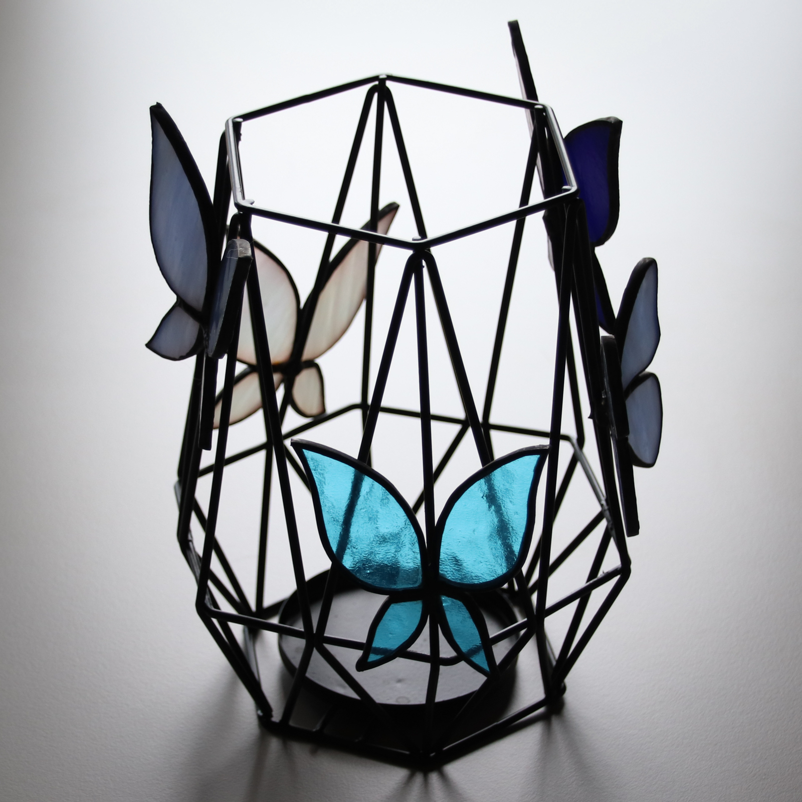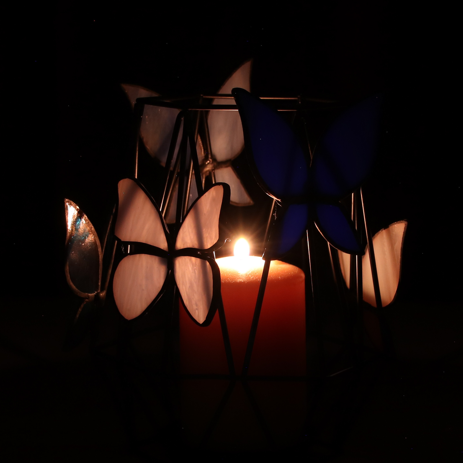 Felinar cu fluturi din sticla colorata, realizati in tehnica Tiffany. Produs unicat, lucrat manual. Se poate realiza la comanda si poate fi personalizat. Fluturii pot fi de aceeasi culoare sau in culori diferite, in functie de nuantele dorite. Pentru mai multe detalii, folositi formularul de contact.