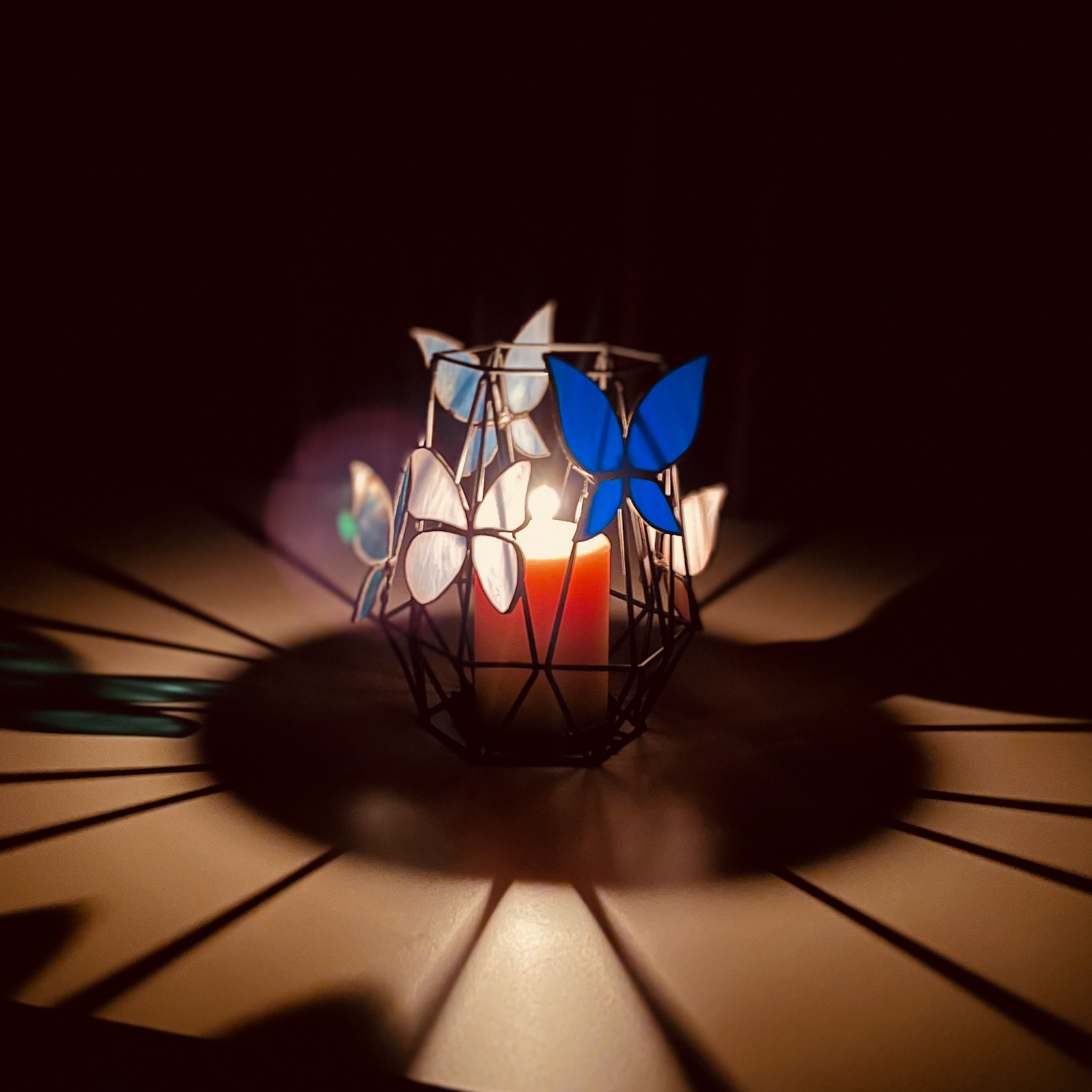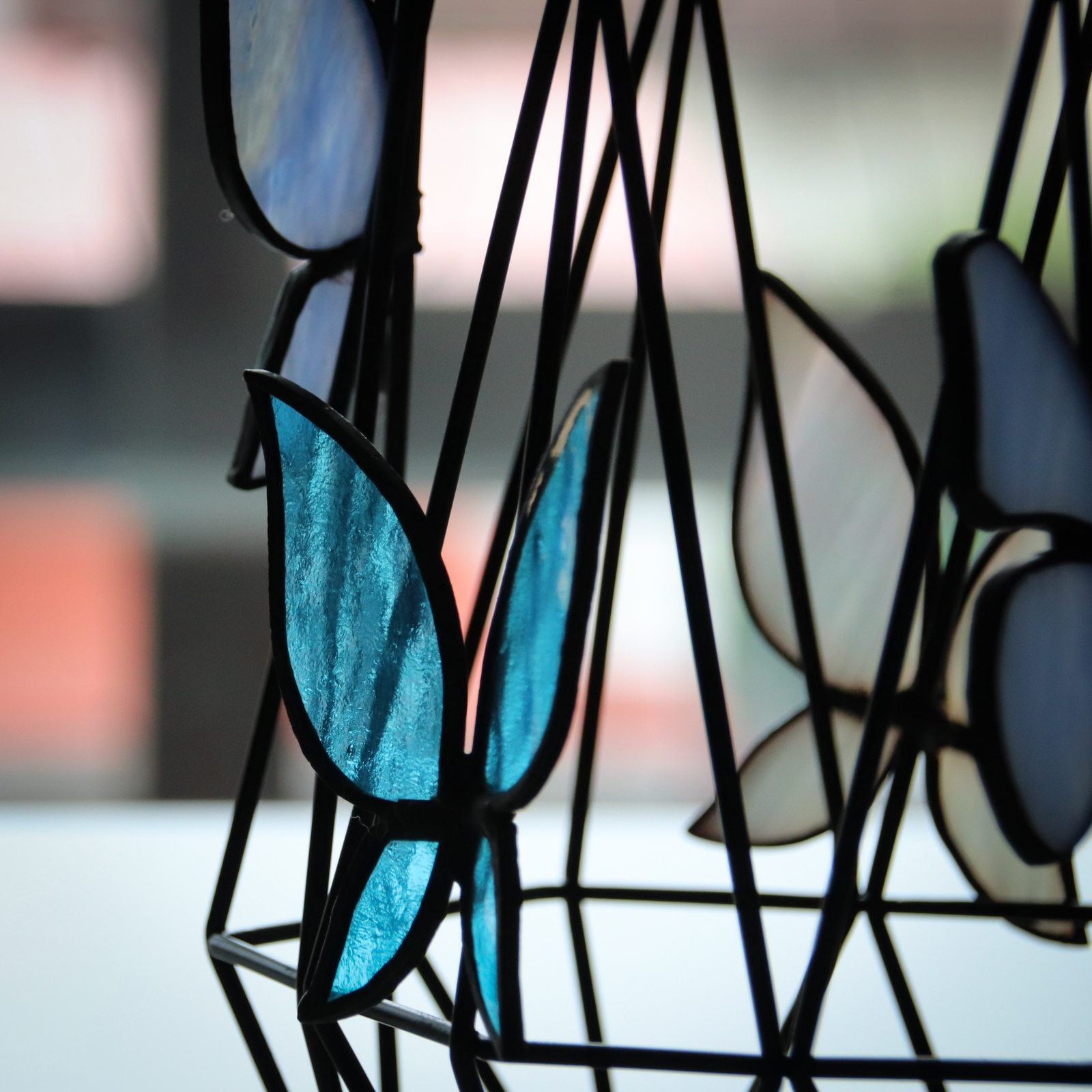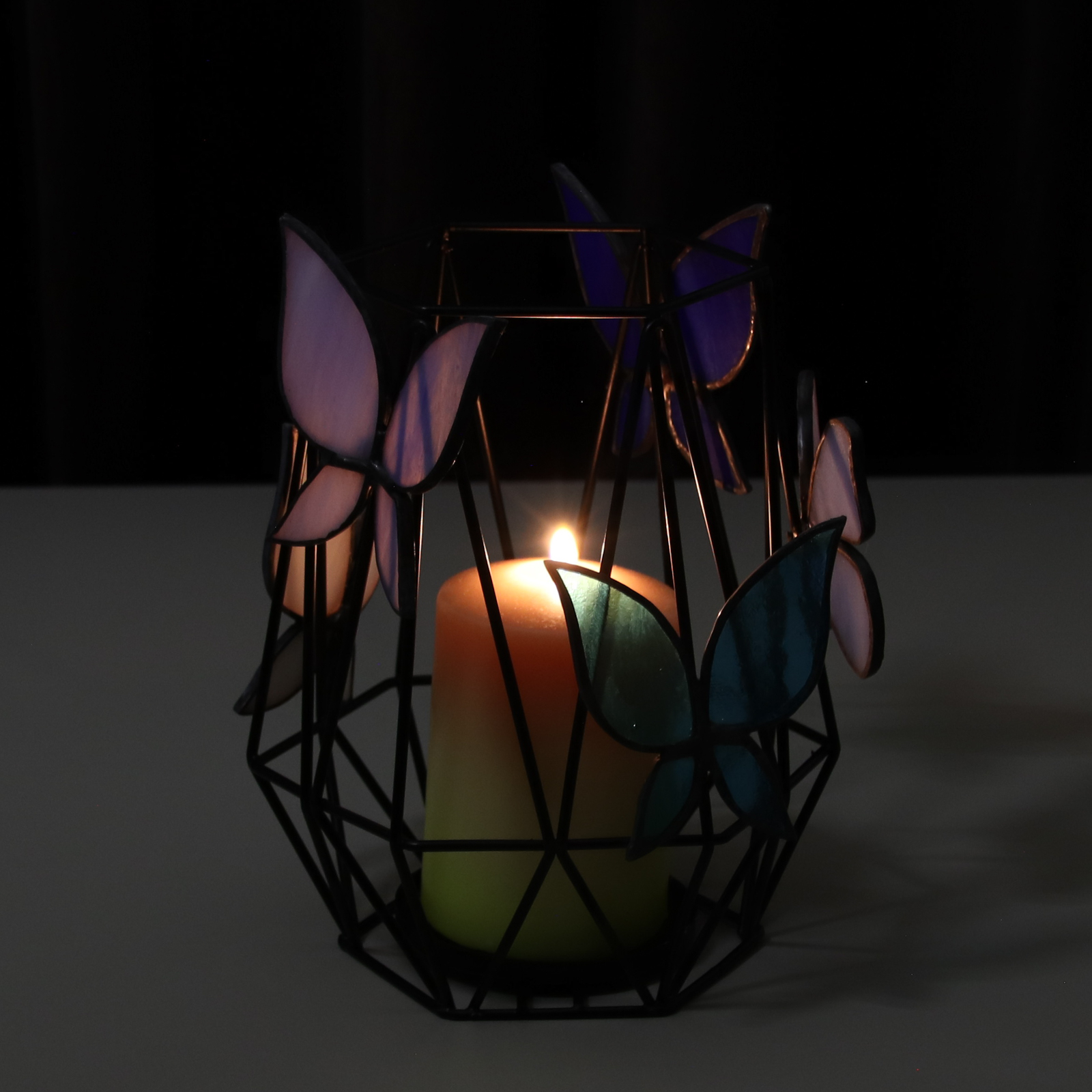 Felinar cu fluturi din sticla colorata, realizati in tehnica Tiffany. Produs unicat, lucrat manual. Se poate realiza la comanda si poate fi personalizat. Fluturii pot fi de aceeasi culoare sau in culori diferite, in functie de nuantele dorite. Pentru mai multe detalii, folositi formularul de contact.