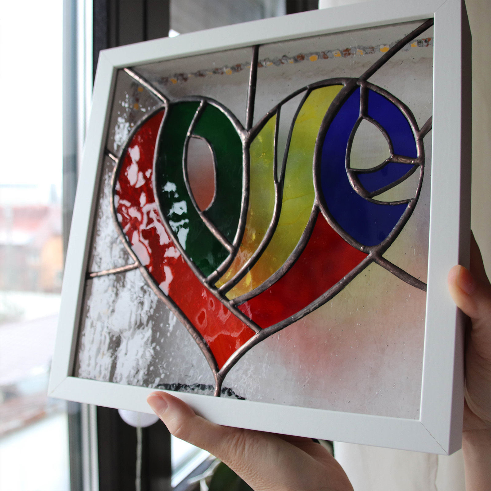 O lampa care spune totul printr-un singur cuvant: LOVE. Aceasta piesa este realizata manual, din sticla vitraliu colorata, asamblata in tehnica Tiffany si montata intr-o rama din lemn cu iluminare LED (alimentare USB). Cand lumina se aprinde, vitraliul prinde viata, transformand lampa intr-un accent spectaculos pentru orice colt din casa.