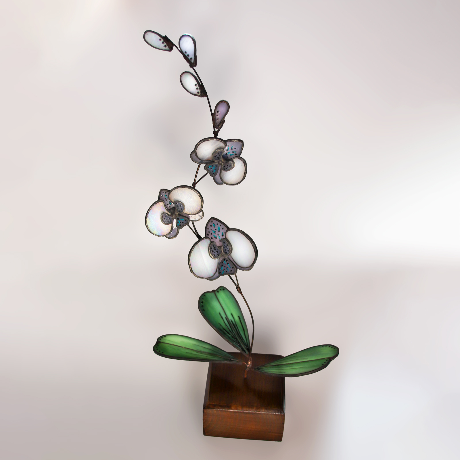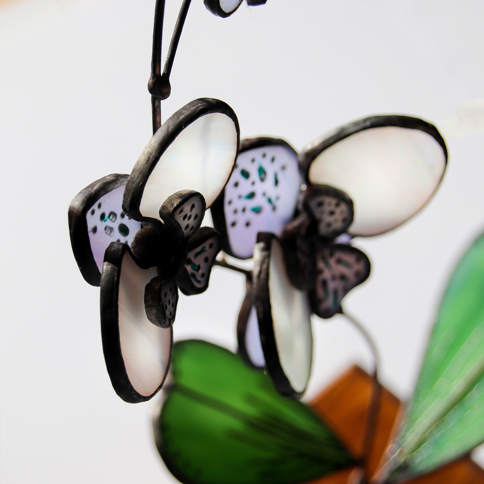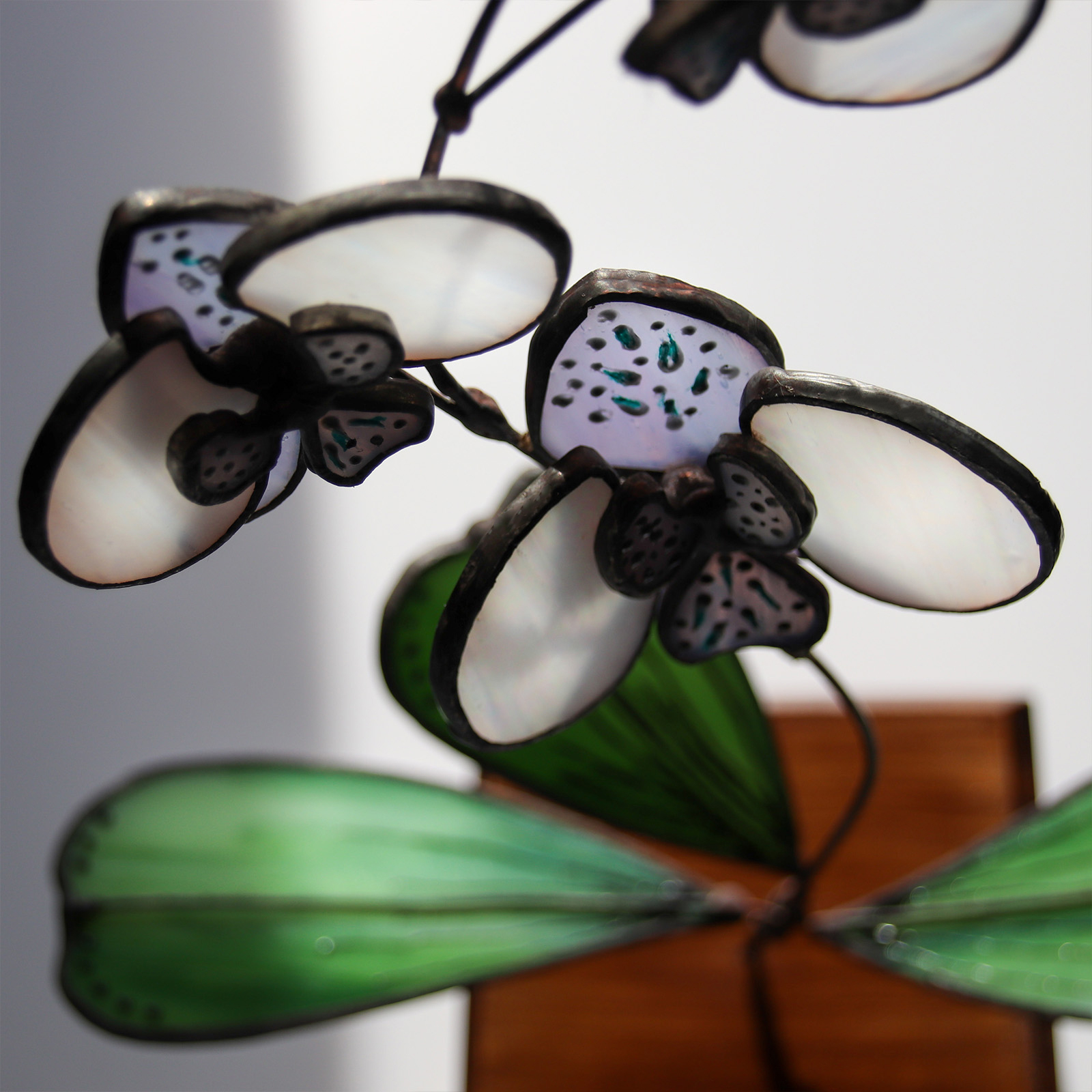 O orhidee delicată, creată manual din sticlă vitraliu alb sidefat, montată într-un suport din lemn natural. Lucrată în tehnica Tiffany, această decoratiune florală 3D captează lumina într-un mod subtil și elegant, devenind o piesă unicat ce aduce rafinament și calm în orice spațiu.