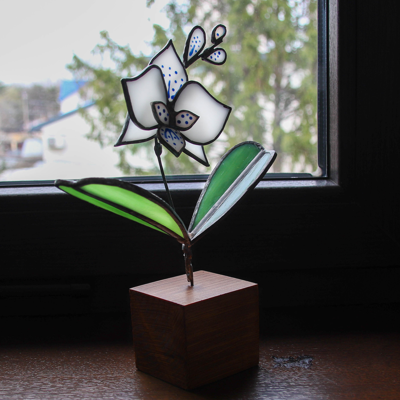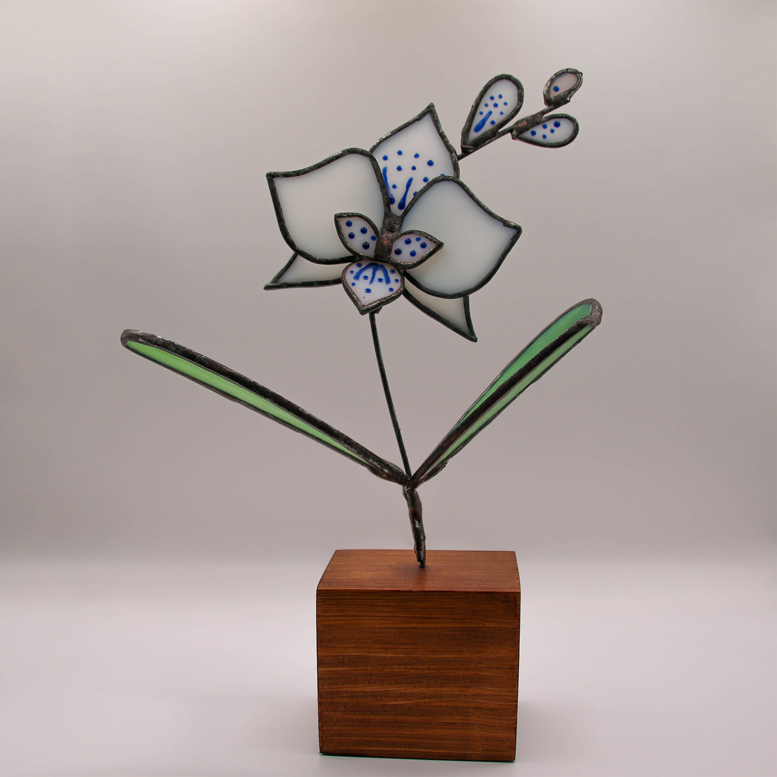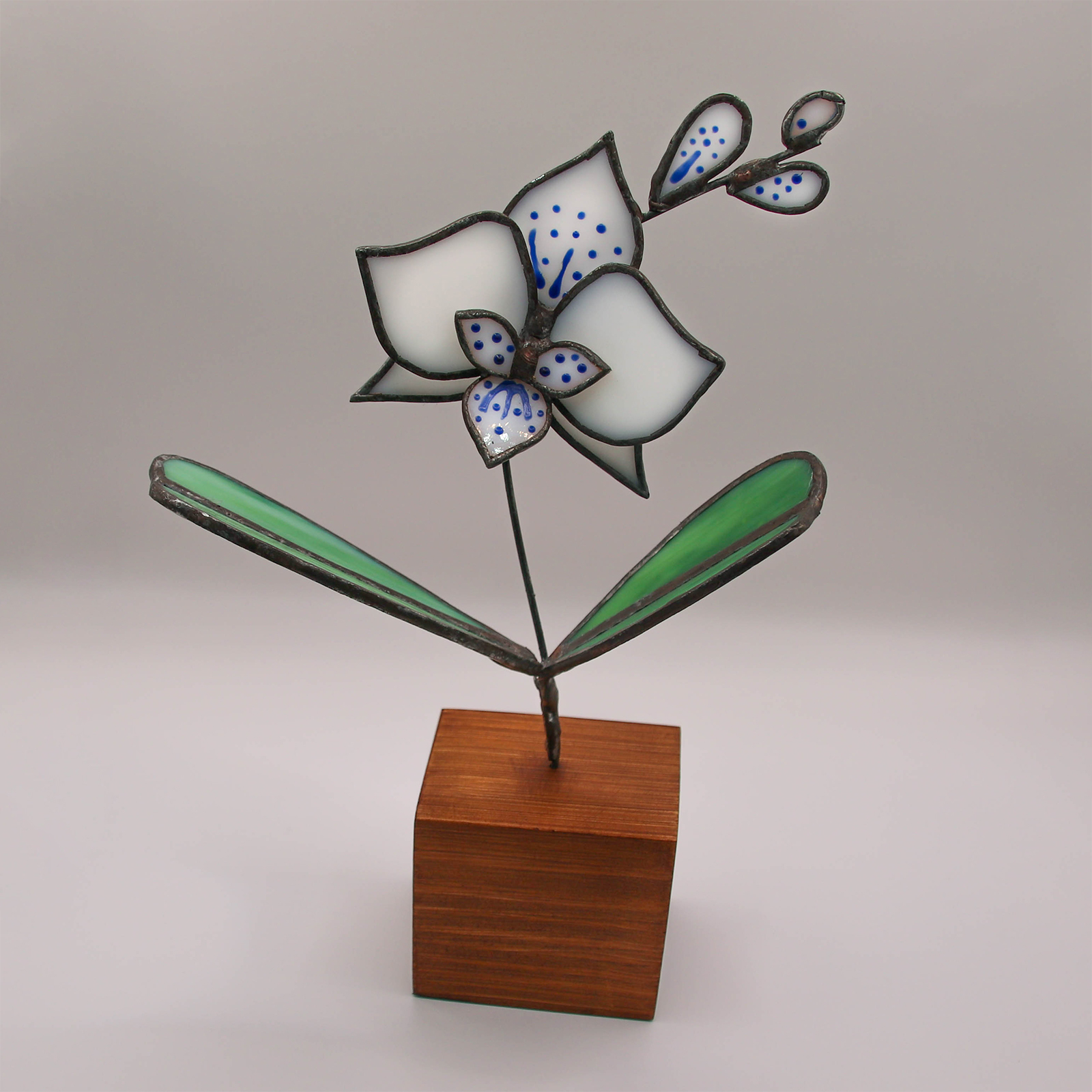 O reinterpretare delicata a naturii in sticla. Aceasta orhidee mica din vitraliu este realizata manual, cu petale albe si accente verzi, din sticla opalescenta care capteaza lumina intr-un mod subtil si elegant.