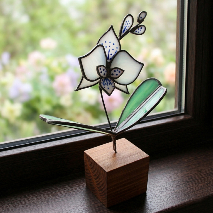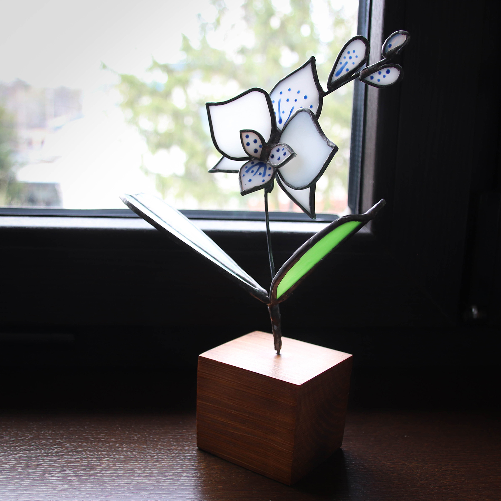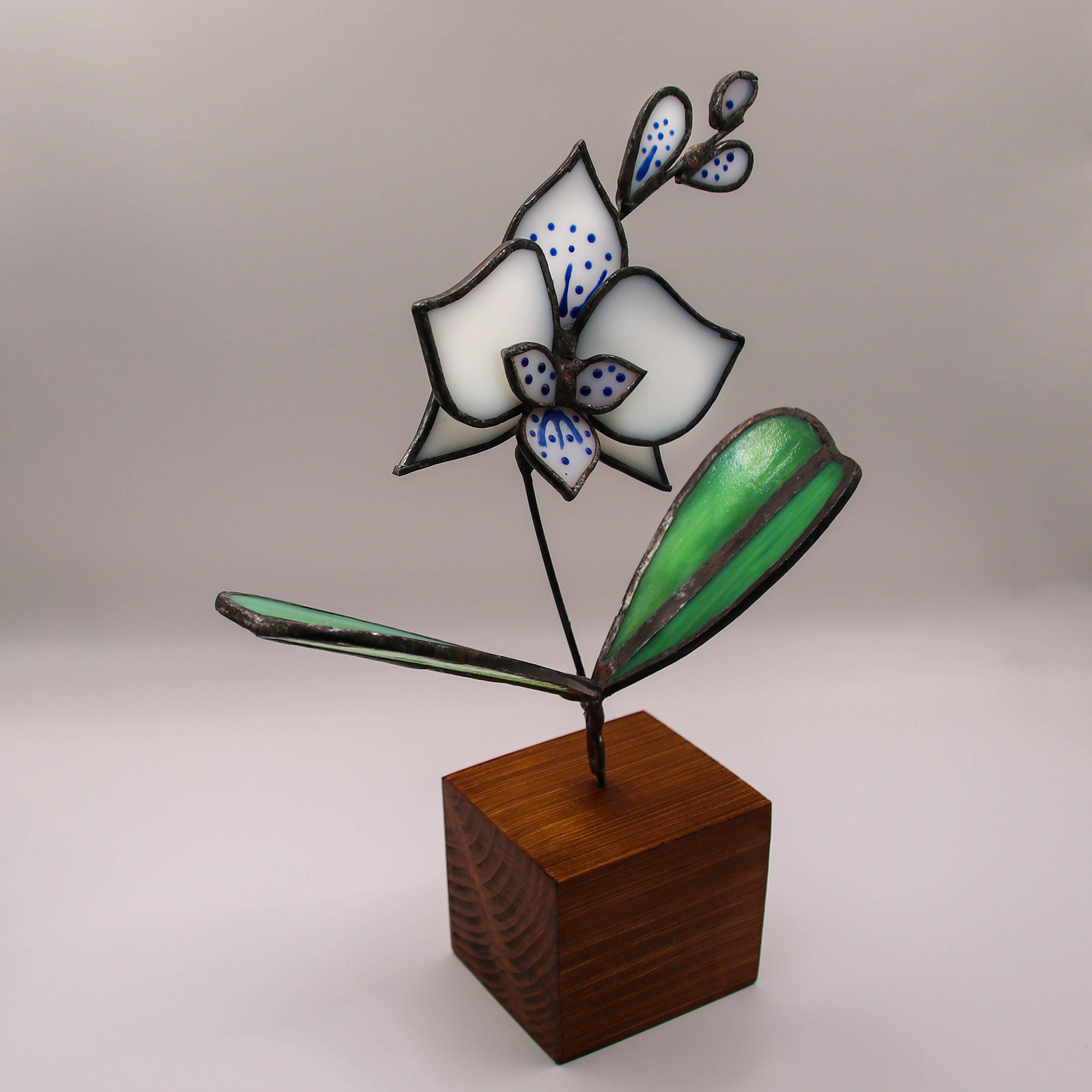 O reinterpretare delicata a naturii in sticla. Aceasta orhidee mica din vitraliu este realizata manual, cu petale albe si accente verzi, din sticla opalescenta care capteaza lumina intr-un mod subtil si elegant.