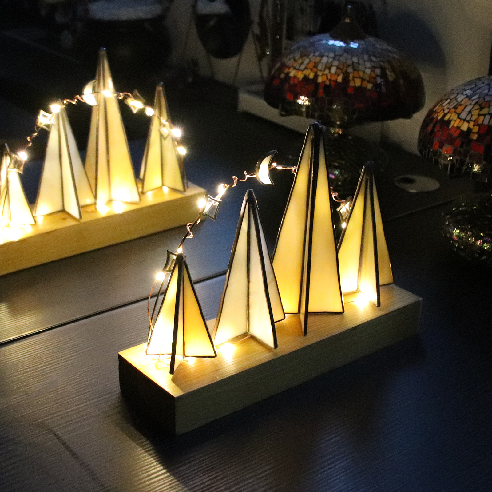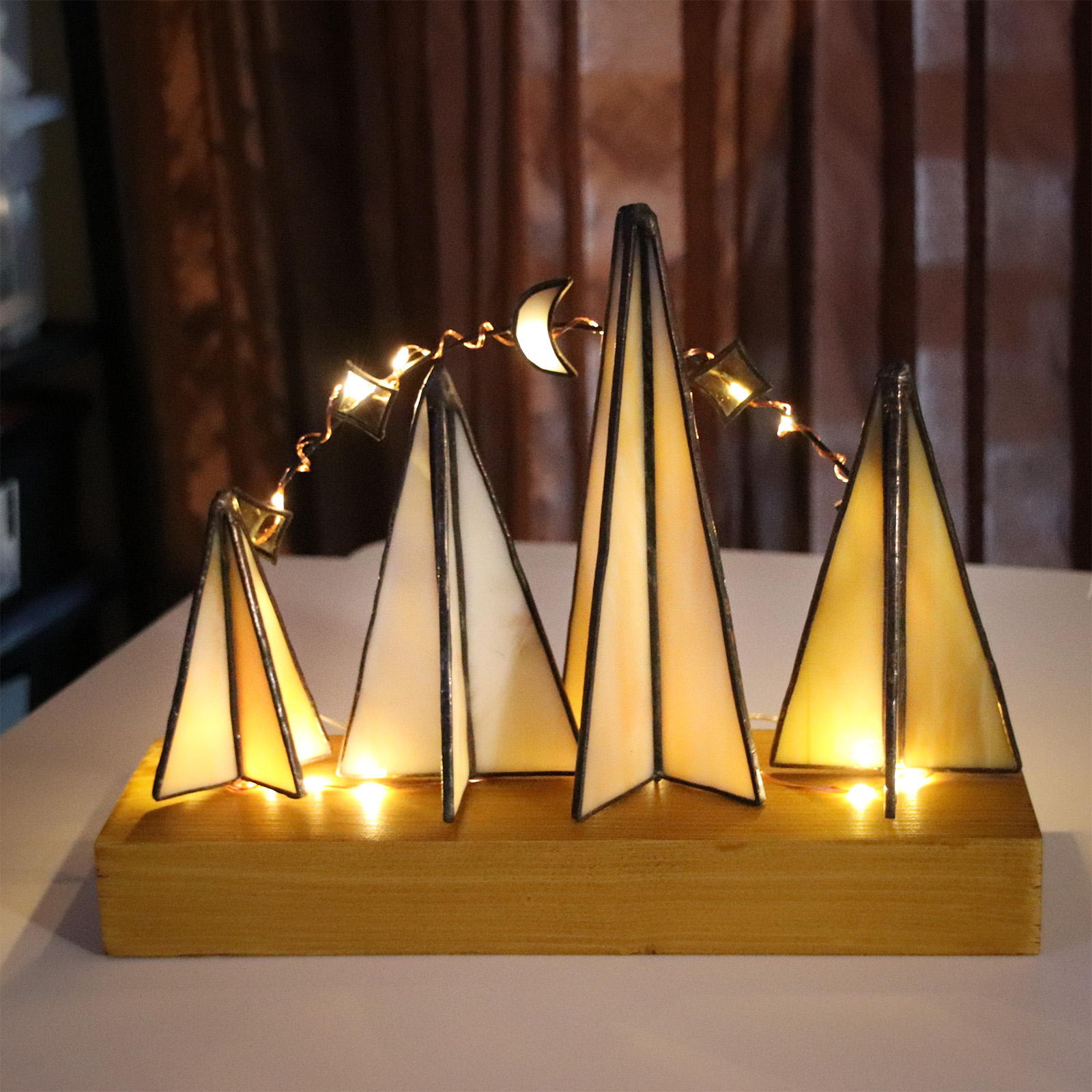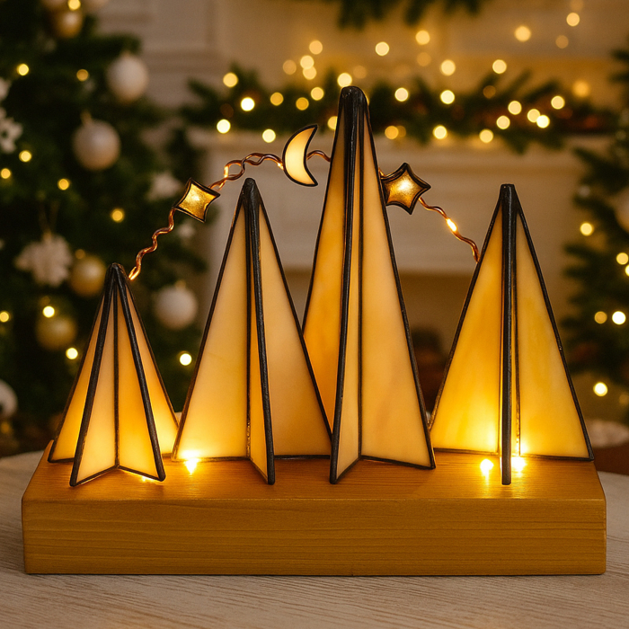 Un decor handmade cu totul special: 4 braduti din sticla galbena, fixati intr-un suport din lemn natural, cu lumini LED care creeaza un efect cald si festiv. Lucrat manual in tehnica Tiffany, acest obiect unicat reflecta lumina intr-un mod spectaculos si poate fi folosit atat ca decor de iarna, cat si ca piesa de accent pe tot parcursul anului. Un cadou cu suflet, pentru casa sau birou.