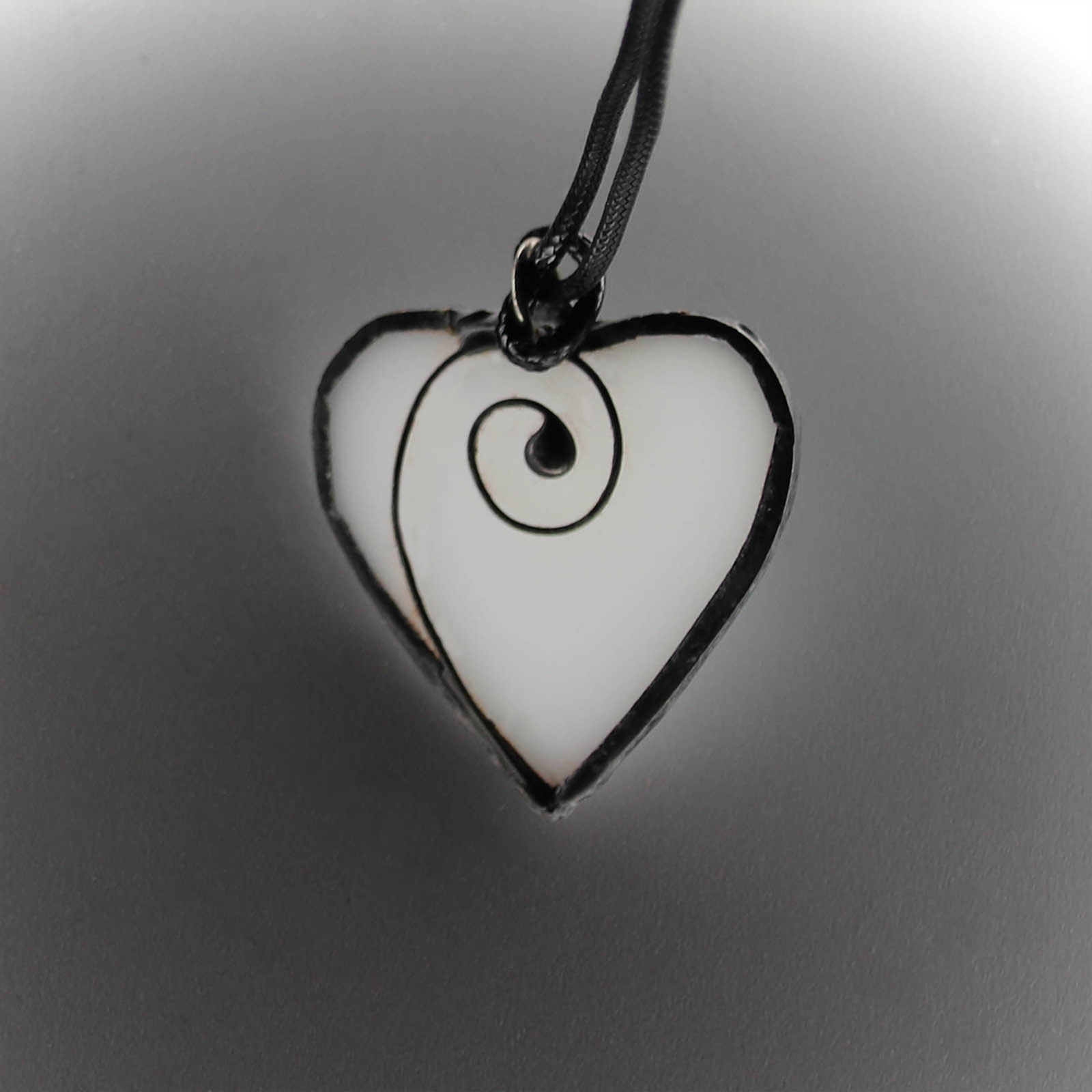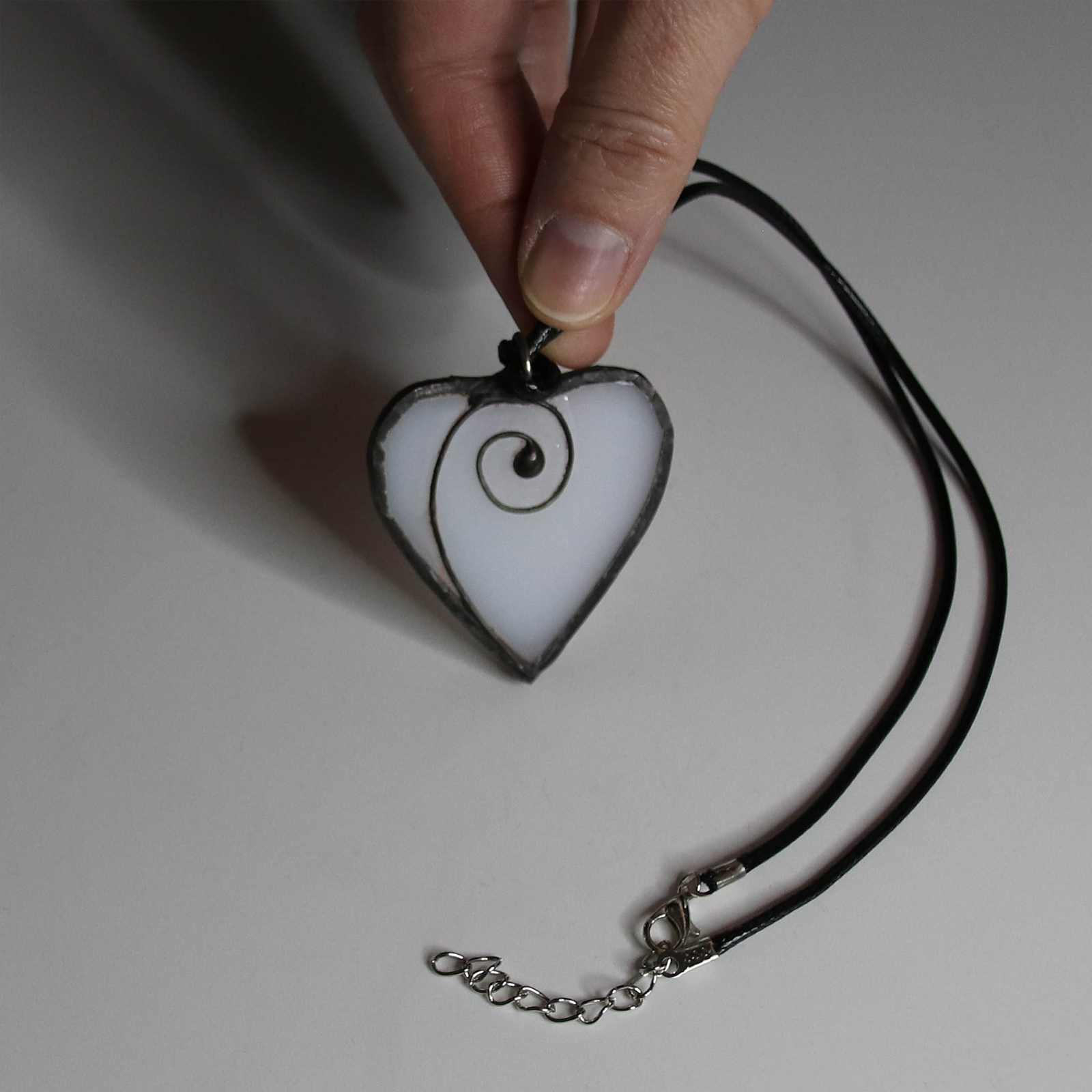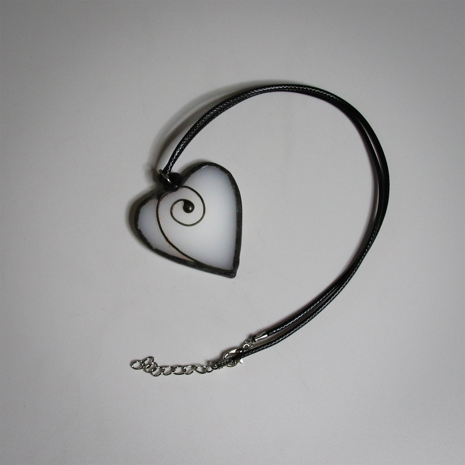 Un pandantiv simplu si elegant, in forma de inima, realizat manual din sticla vitraliu alba opalescenta.