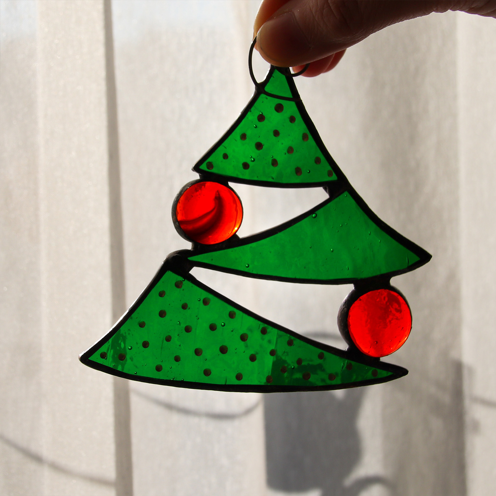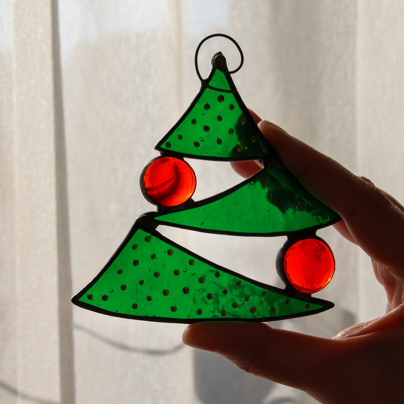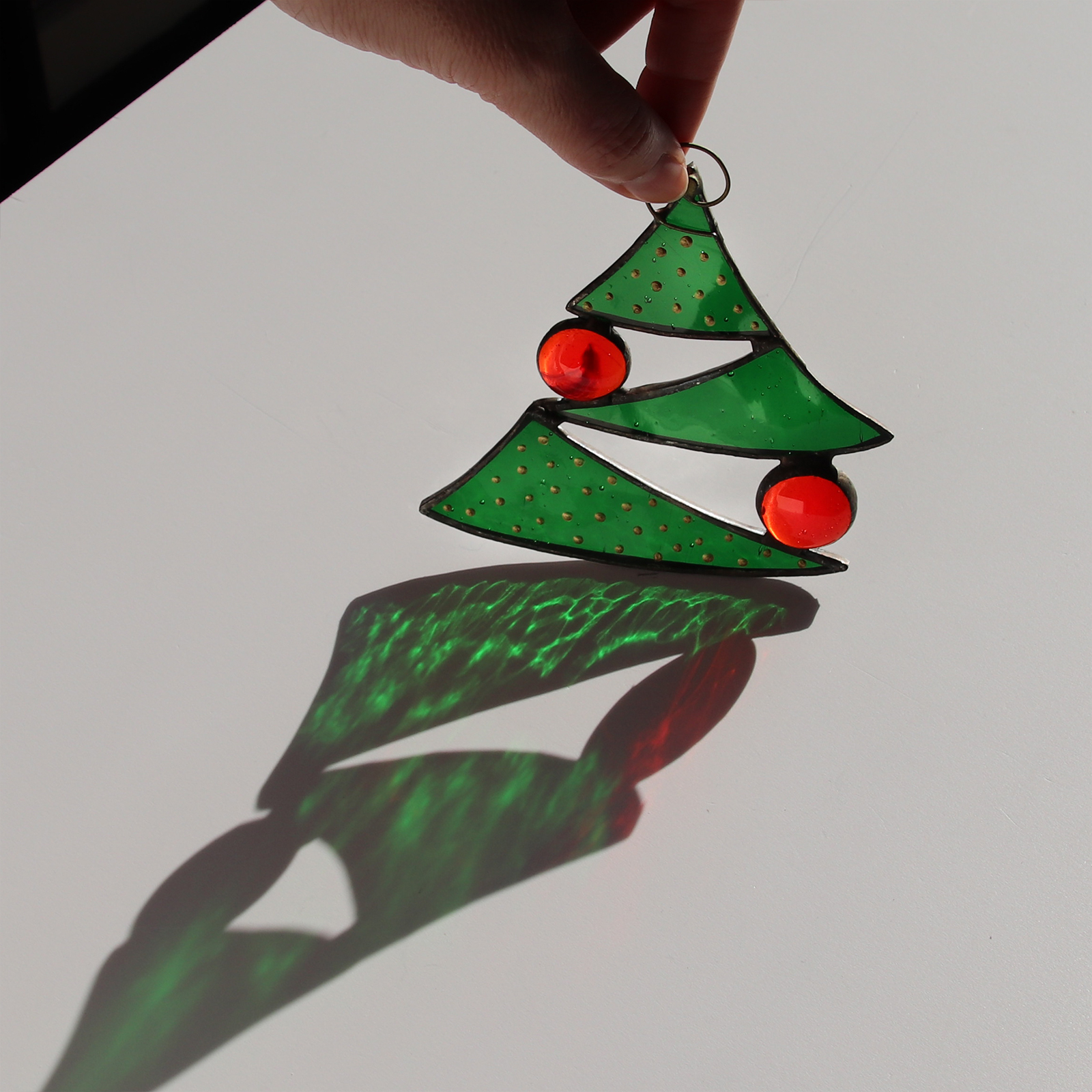 Un ornament clasic reinterpretat: bradut din vitraliu verde cu un detaliu rosu care atrage privirea. Realizat manual in tehnica Tiffany, acest bradut aduce un plus de culoare, lumina si traditie in decorul tau de sarbatori – sau tot anul, daca iubesti spiritul Craciunului.