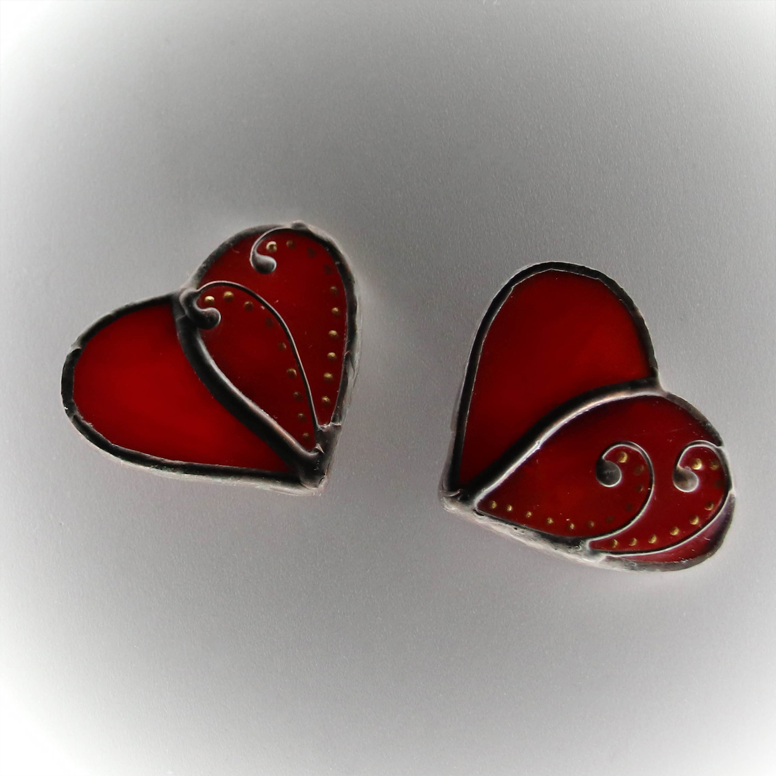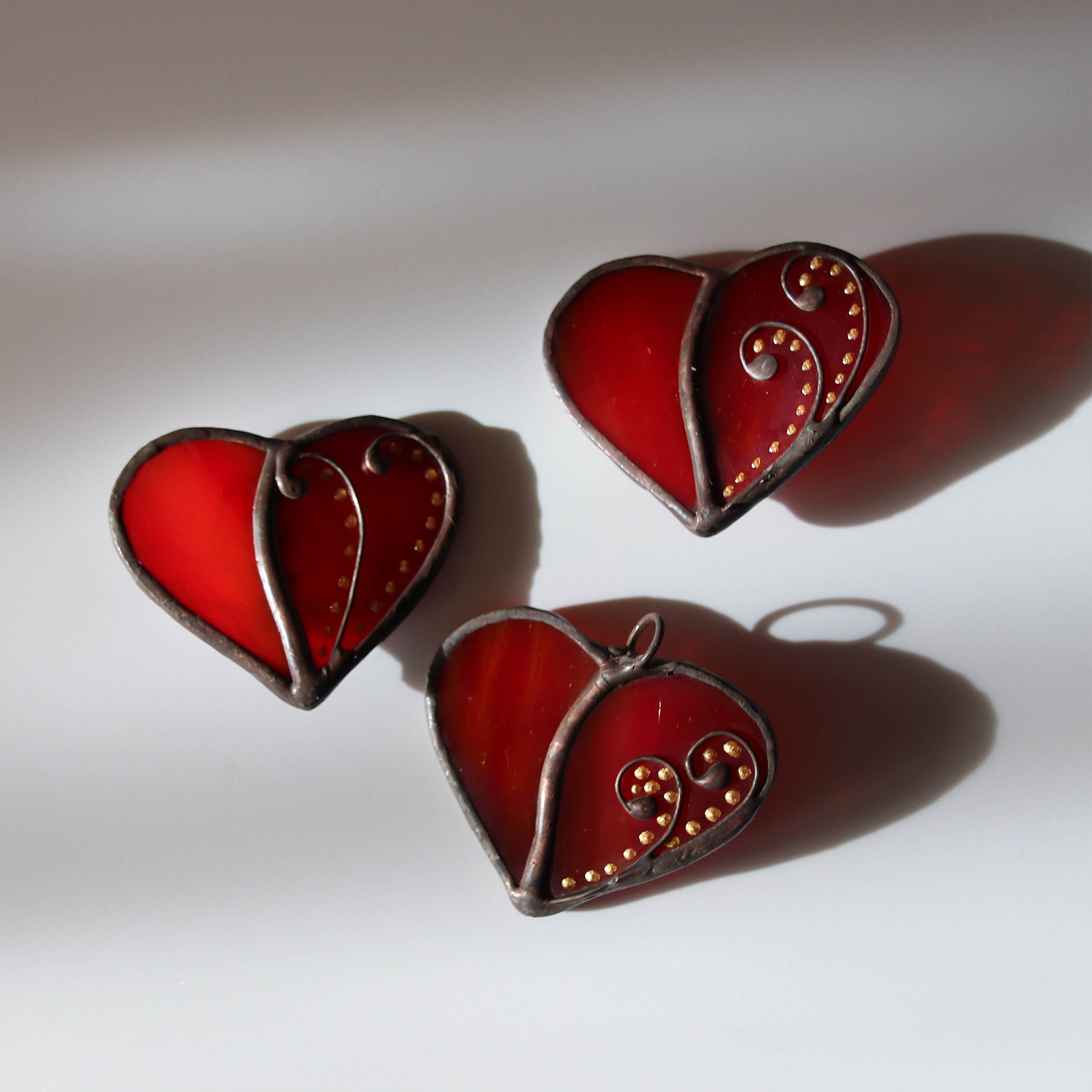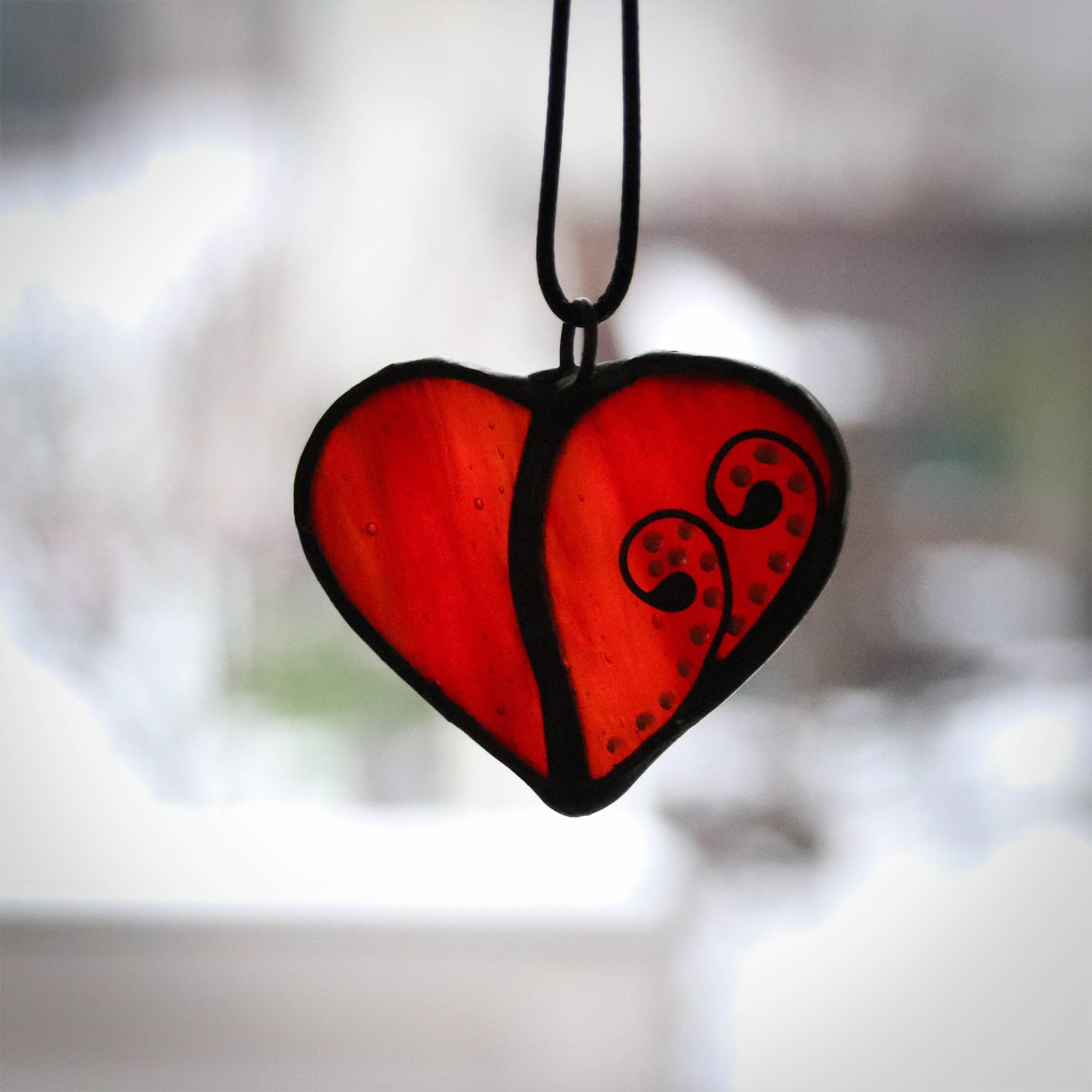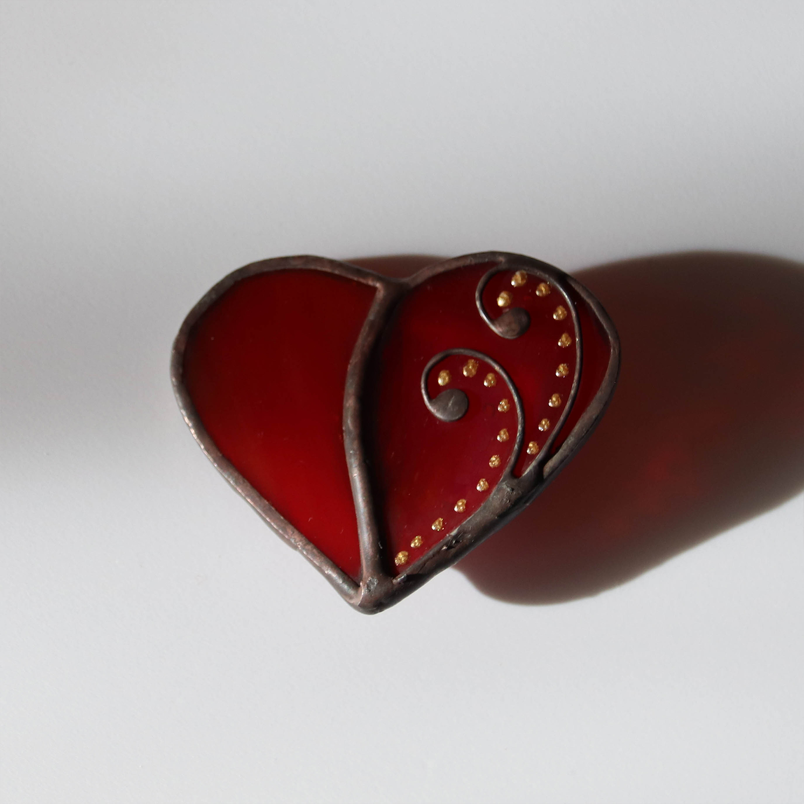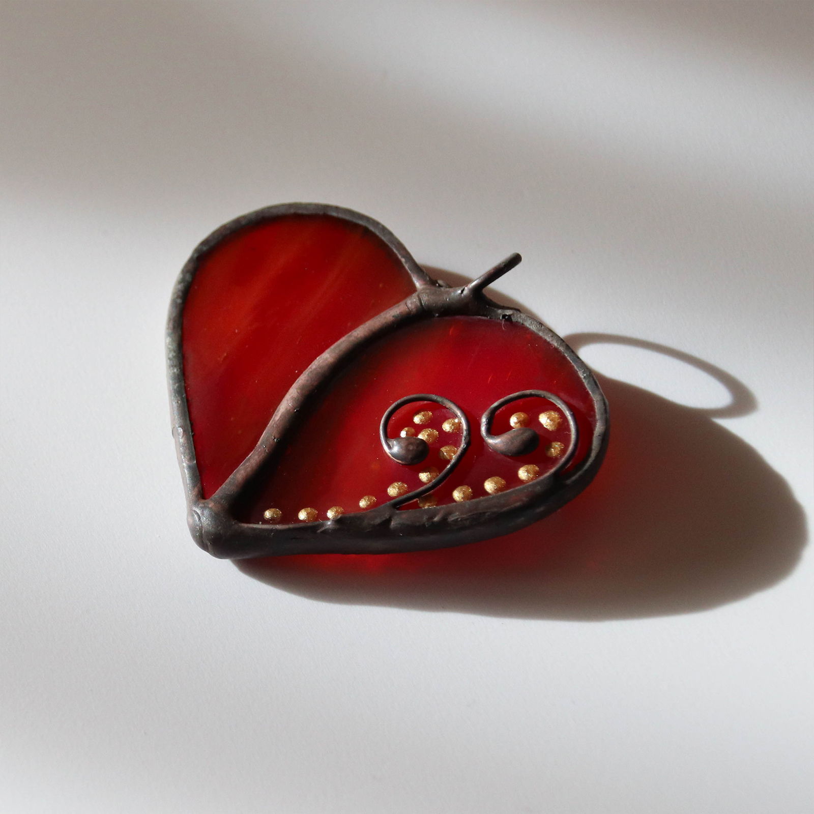 Pandantiv handmade in forma de inima, realizat din sticla vitraliu rosie, decorat cu un element din cupru si pictura punctiforma aplicata manual.