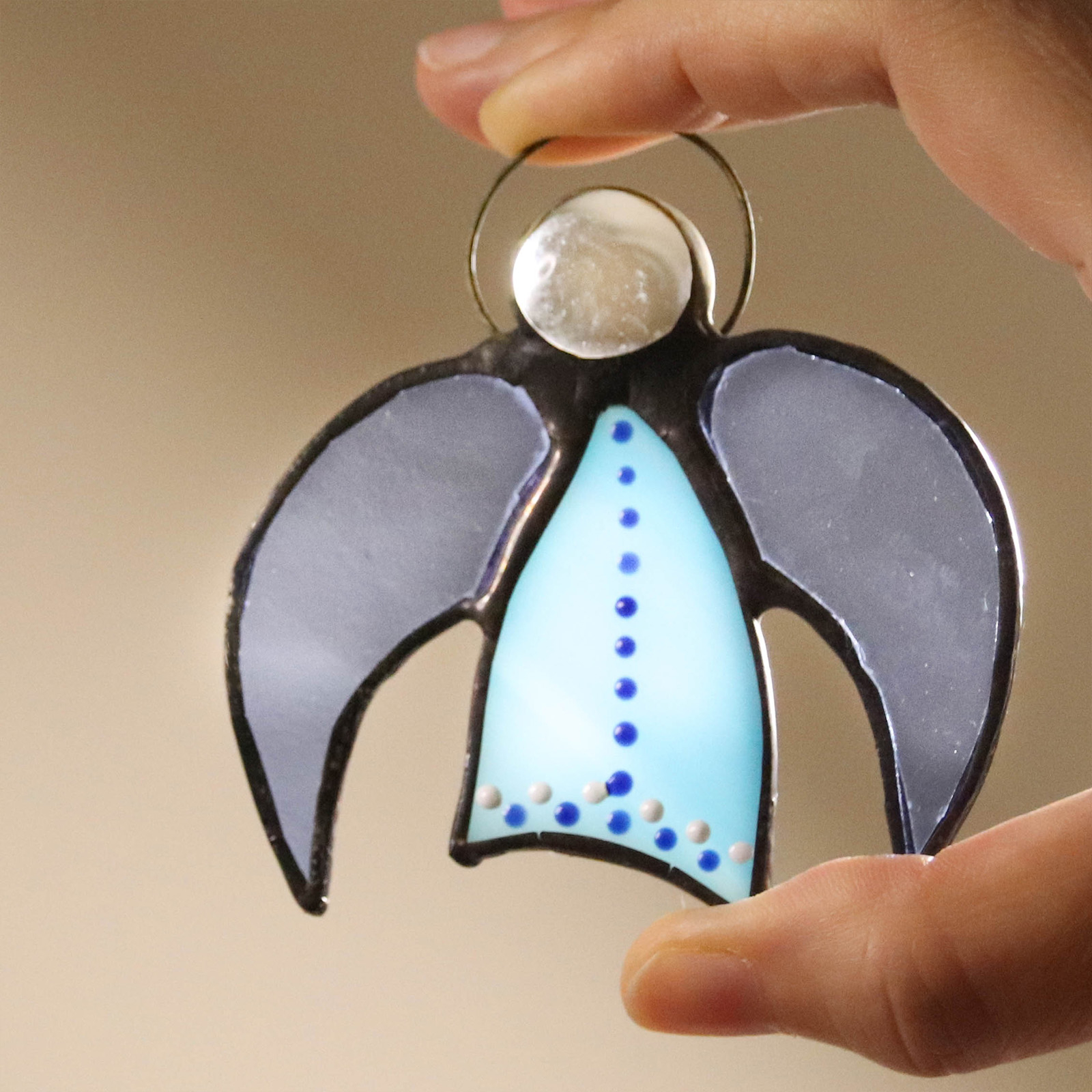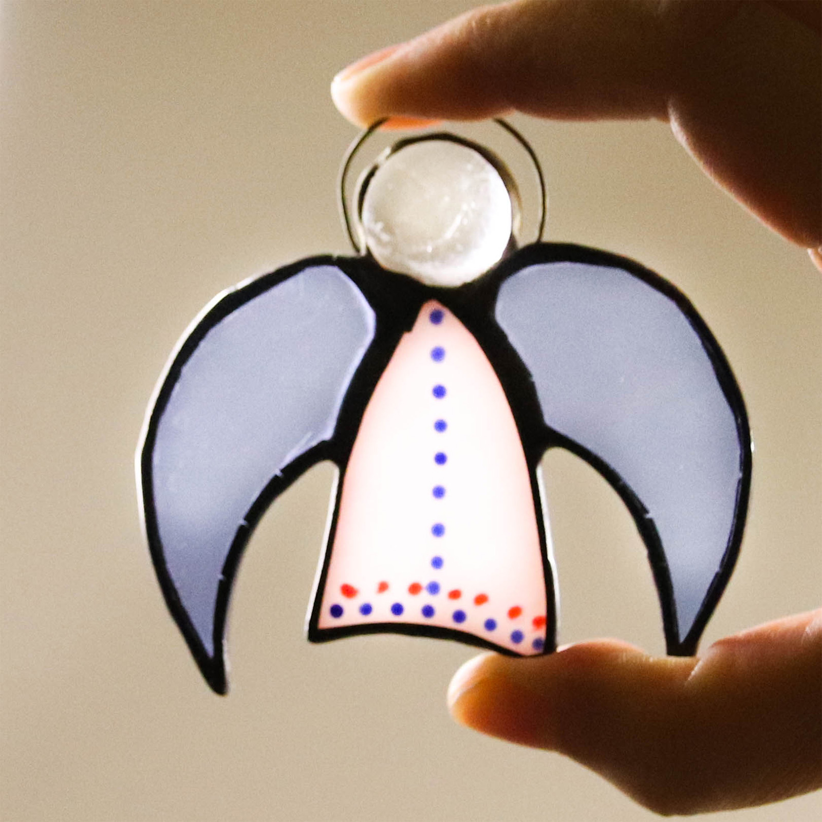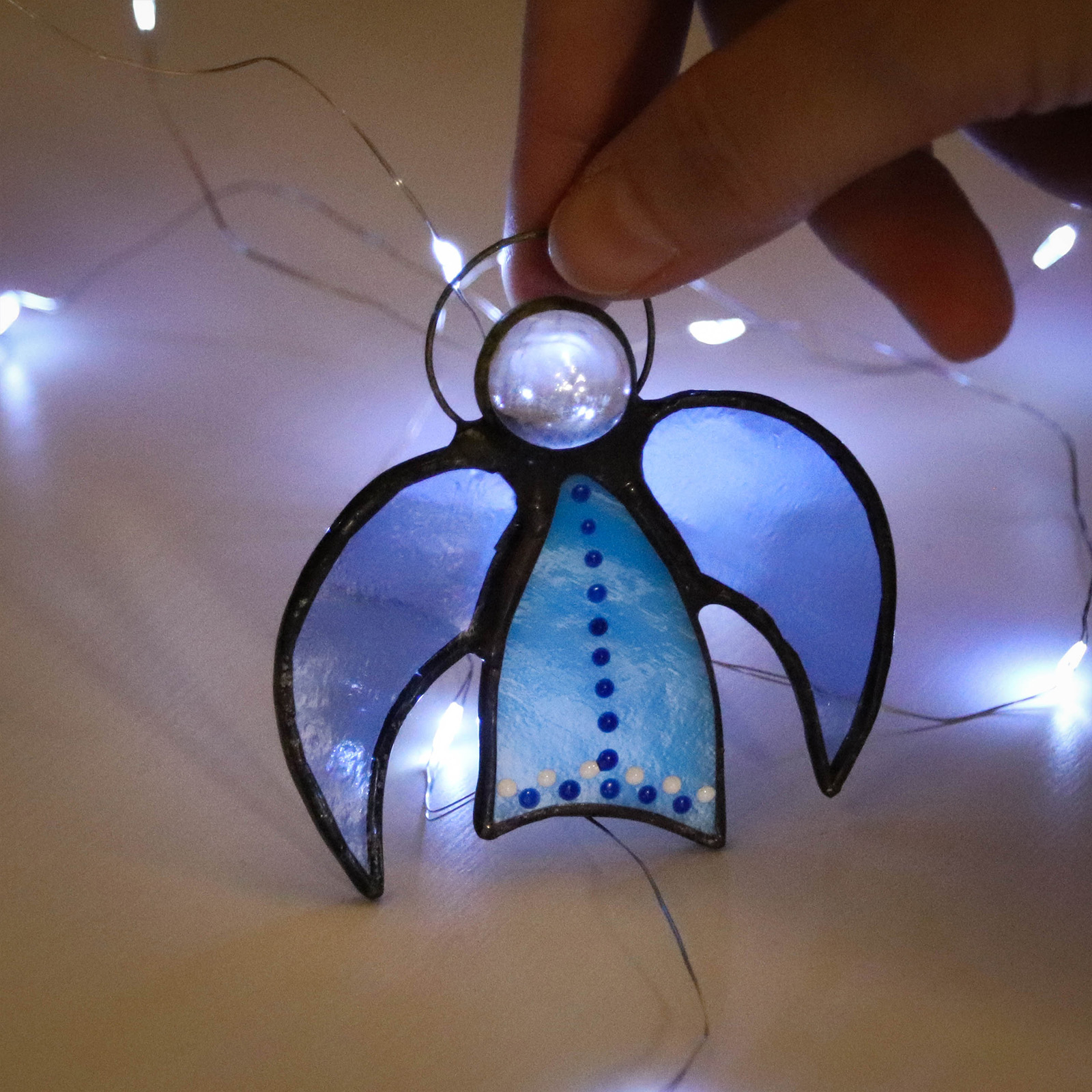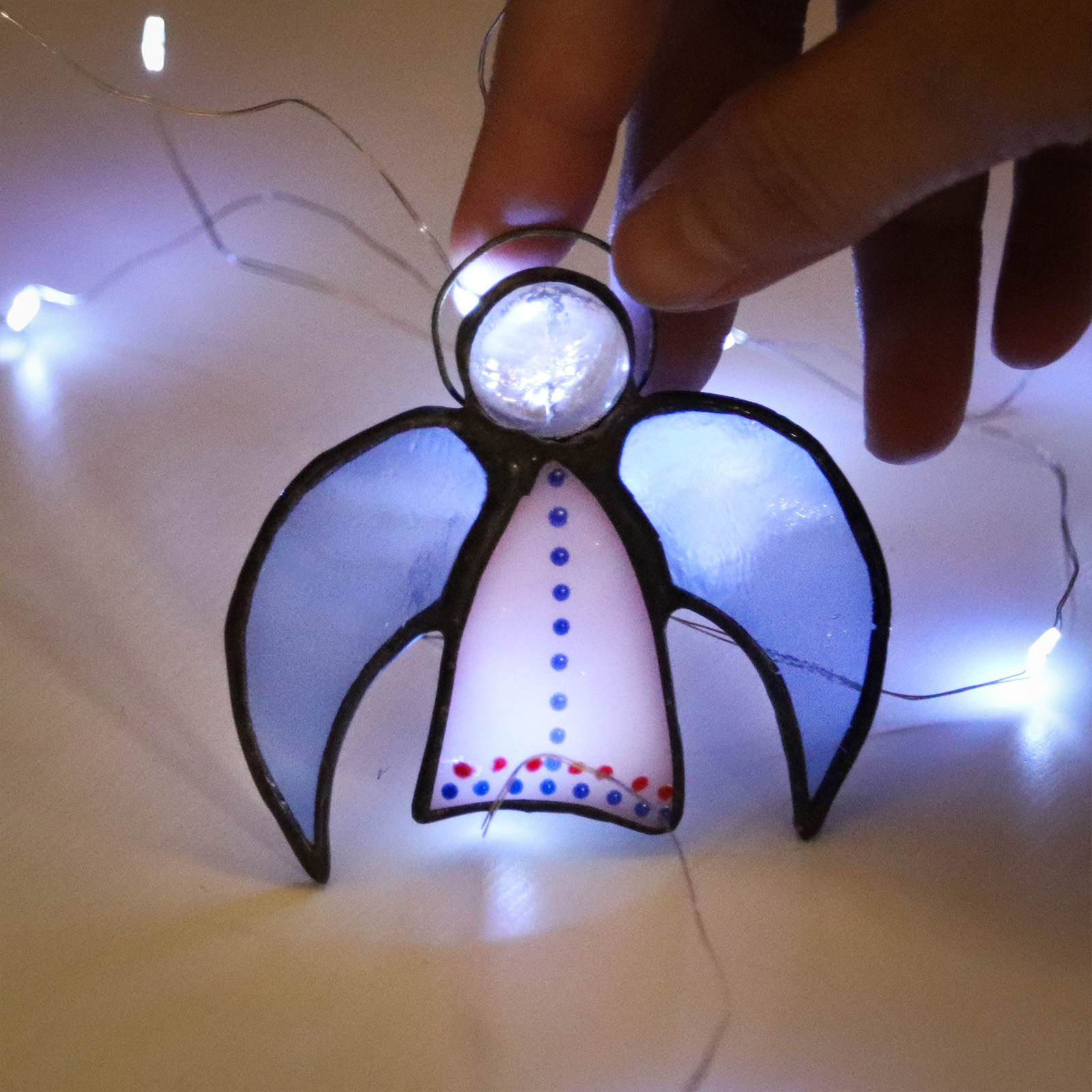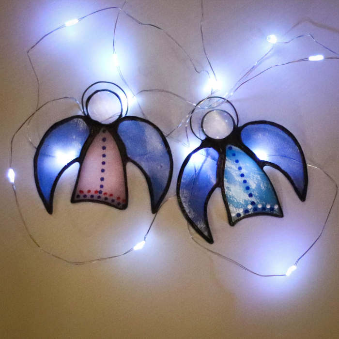 Setul de 2 ingerasi din vitraliu este realizat manual in tehnica Tiffany, din sticla colorata, cupru si cositor. Designul simplu si expresiv pune in valoare lumina si culoarea, facand din fiecare piesa un obiect decorativ unicat. Pot fi agatati in bradul de Craciun, asezati pe raft, pe masa sau oferiti in dar unei persoane dragi.
